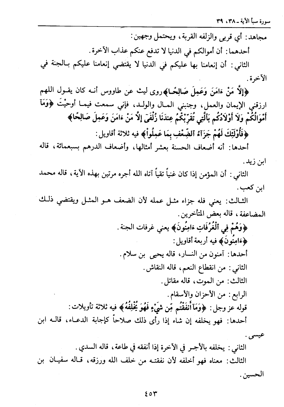 مجاهد: أي قربى والزلفة القربة , ويحتمل وجهين: أحدهما: أن أموالكم في الدنيا لا تدفع عنكم عذاب الآخرة. الثاني: أن إنعامنا بها عليكم في الدنيا لا يقتضي إنعامنا عليكم بالجنة في الآخرة. {إلاَّ مَنْءَامَنَ وَعَمِلَ صَالِحاً} روى ليث عن طاووس أنه كان يقول اللهم ارزقني الإيمان والعمل , وجنبني المال والولد , فإني سمعت فيما أوحيْتَ {وَمَآ أَمْوَالُكُمْ وَلاَ أَوْلاَدُكُمْ بَالَّتِي تُقَرِّبْكْمُ عِندَنَا زُلْفَى إلاَّ مَنْءَامَنَ وَعَمِلَ صالِحاً}. {فَأُوْلئِكَ لَهُمْ جَزَآءُ الضِّعْفِ بِمَا عَمِلُواْ} فيه ثلاثة أقاويل: أحدها: أنه أضعاف الحسنة بعشر أمثالها , وأضعاف الدرهم بسبعمائة , قاله ابن زيد. الثاني: أن المؤمن إذا كان غنياً تقياً آتاه الله أجره مرتين بهذه الآية , قاله محمد بن كعب. الثالث: يعني فله جزاء مثل عمله لأن الضعف هو المثل ويقتضي ذلك المضاعفة , قاله بعض المتأخرين. {وَهُمْ فِي الْغُرُفَاتِءَامِنُونَ} يعني غرفات الجنة. {ءَامِنُونَ} فيه أربعة أقاويل: أحدها: آمنون من النار , قاله يحيى ابن سلام. الثاني: من انقطاع النعم , قاله النقاش. الثالث: من الموت , قاله مقاتل. الرابع: من الأحزان والأسقام. قوله عز وجل: {وَمآ أَنفَقْتُم مِّن شَيْءٍ فَهُوَ يُخْلِفُهُ} فيه ثلاثة تأويلات: أحدها: فهو يخلفه إن شاء إذا رأى ذلك صلاحاً كإجابة الدعاء , قاله ابن عيسى. الثاني: يخلفه بالأجر في الآخرة إذا أنفقه في طاعة , قاله السدي. الثالث: معناه فهو أخلفه لأنه نفقته من خلف الله ورزقه , قاله سفيان بن الحسين.