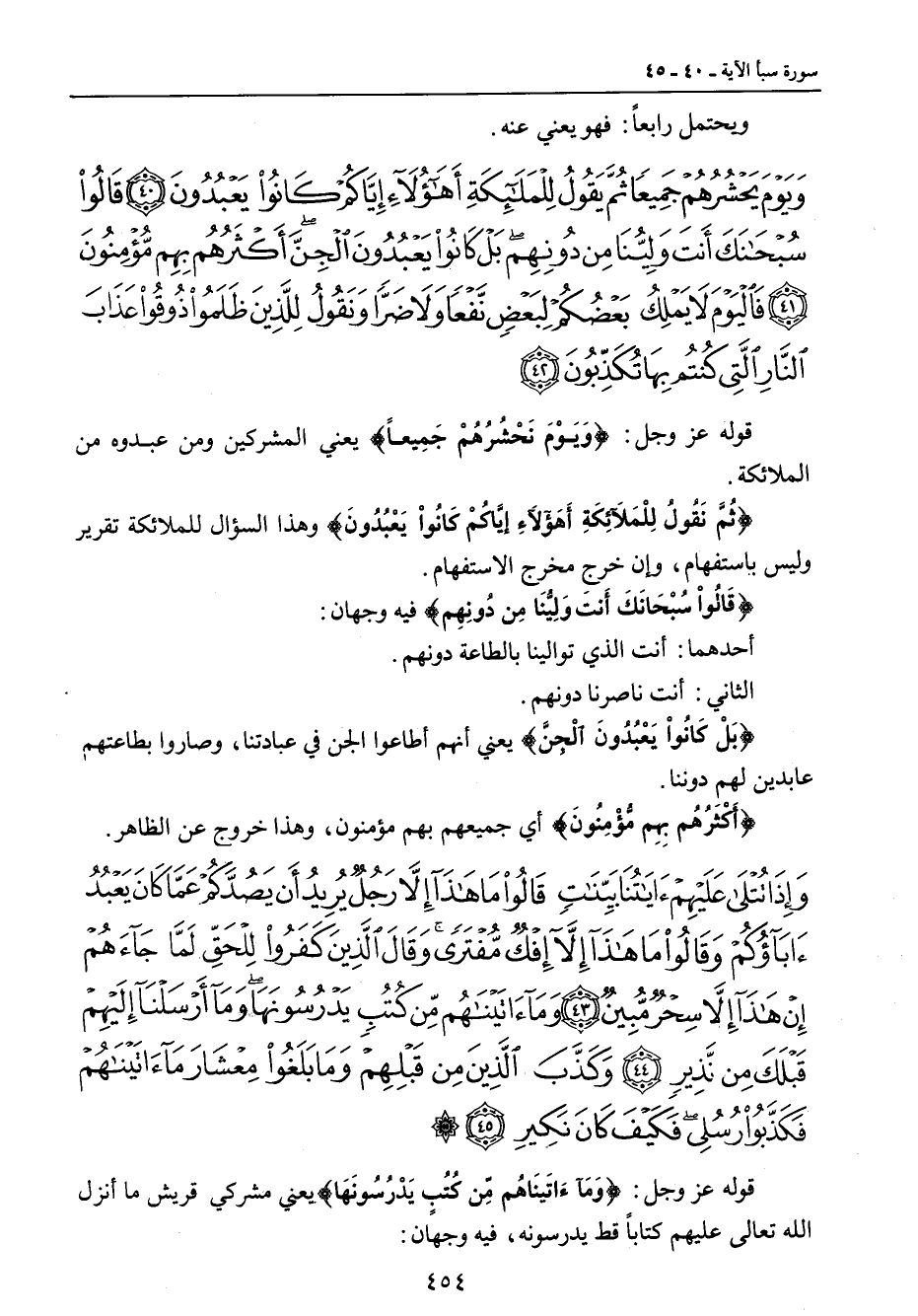 {ويوم يحشرهم جميعا ثم يقول للملائكة أهؤلاء إياكم كانوا يعبدون قالوا سبحانك أنت ولينا من دونهم بل كانوا يعبدون الجن أكثرهم بهم مؤمنون فاليوم لا يملك بعضكم لبعض نفعا ولا ضرا ونقول للذين ظلموا ذوقوا عذاب النار التي كنتم بها تكذبون} قوله عز وجل: {وَيَوْمَ نَحْشُرُهُمْ جَمِيعاً} يعني المشركين ومن عبدوه من الملائكة. {ثُمَّ نَقُولُ لِلْمَلآَئِكَةِ أَهَؤلآَءِ إِيَّاكُمْ كَانُواْ يَعْبُدُونَ} وهذا السؤال للملائكة تقرير وليس باستفهام , وإن خرج مخرج الاستفهام. {قََالُواْ سُبْحَانَكَ أَنتَ وَلِيُّنَا مِن دُونِهِم} فيه وجهان: أحدهما: أنت الذي توالينا بالطاعة دونهم. الثاني: أنت ناصرنا دونهم. {بَلْ كَانُواْ يَعْبُدُونَ الْجِنَّ} يعني أنهم أطاعوا الجن في عبادتنا , وصاروا بطاعتهم عابدين لهم دوننا. {أَكْثَرُهُم بِهِم مُّؤْمِنُونَ} أي جميعهم بهم مؤمنون , وهذا خروج عن الظاهر.