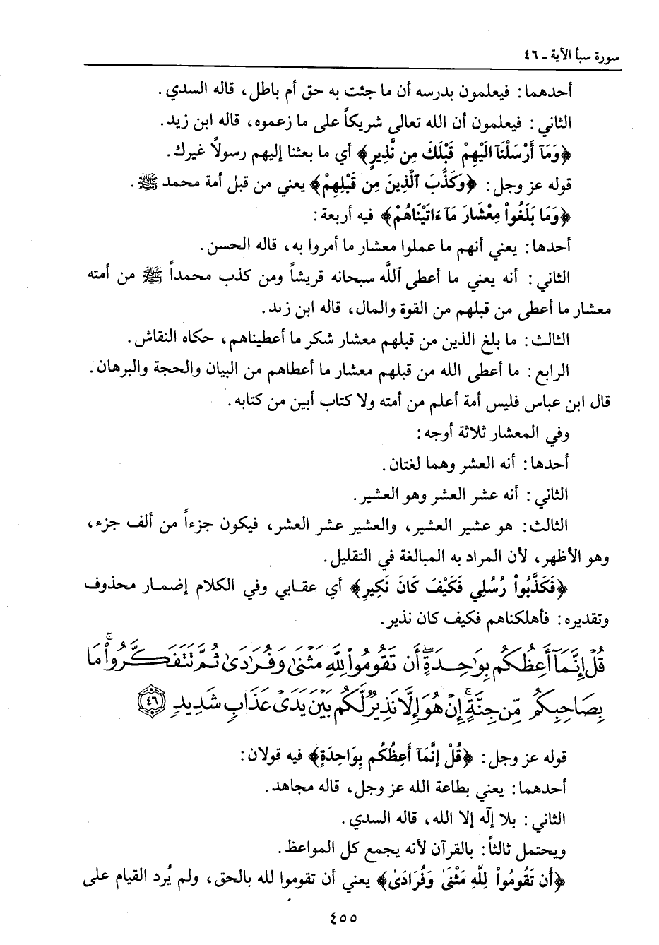 {قل إنما أعظكم بواحدة أن تقوموا لله مثنى وفرادى ثم تتفكروا ما بصاحبكم من جنة إن هو إلا نذير لكم بين يدي عذاب شديد} قوله عز وجل: {قُلْ إنَّمَآ أَعِظُكُم بِوَاحِدَةٍ} فيه قولان: أحدهما: يعني بطاعة الله عز وجل , قاله مجاهد. الثاني: بالا إله إلا الله , قاله السدي. ويحتمل ثالثاً: بالقرآن لأنه يجمع كل المواعظ. {أَن تَقُومُواْ لِلَّهِ مَثْنَى وَفُرَادَى} يعني أن تقوموا لله بالحق , ولم يُرد القيام على