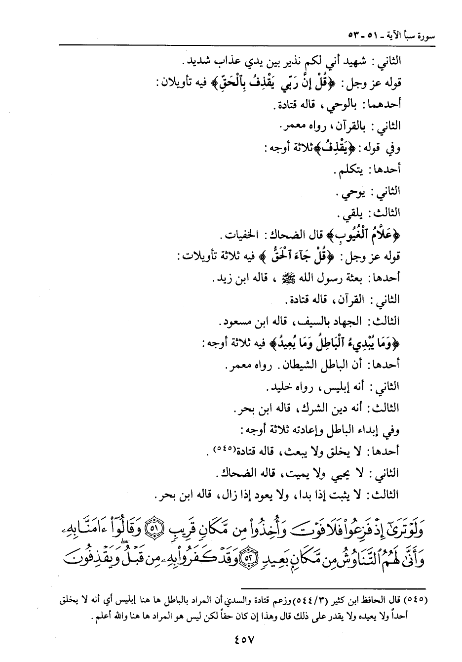 الثاني: شهيد أني لكم نذير بين يدي عذاب شديد. قوله عز وجل: {قُلْ إنَّ رَبِّي يَقْذِفُ بِالْحَقِّ} فيه تأويلان: أحدهما: بالوحي , قاله قتادة. الثاني: بالقرآن , رواه معمر. وفي قوله: {يَقْذِفُ} ثلاثة أوجه: أحدها: يتكلم. الثاني: يوحي. الثالث: يلقي. {عَلاَّمُ الْغُيُوبِ} قال الضحاك: الخفيات. قوله عز وجل: {قُلْ جَآءَ الْحَقُّ} فيه ثلاثة تأويلات: أحدها: بعثة رسول الله صلى الله عليه وسلم , قاله ابن زيد. الثاني: القرآن , قاله قتادة. الثالث: الجهاد بالسيف , قاله ابن مسعود. {وَمَا يُبْدِيءُ الْبَاطِلُ وَمَا يُعِيدُ} فيه ثلاثة أوجه: أحدها: أن الباطل الشيطان. رواه معمر. الثاني: أنه إبليس. رواه خليد. الثالث: أنه دين الشرك , قاله ابن بحر. وفي إبداء الباطل وإعادته ثلاثة أوجه: أحدها: لا يخلق ولا يبعث , قاله قتادة. الثاني: لا يحيي ولا يميت , قاله الضحاك. الثالث: لا يثبت إذا بدا , ولا يعود إذا زال , قاله ابن بحر.