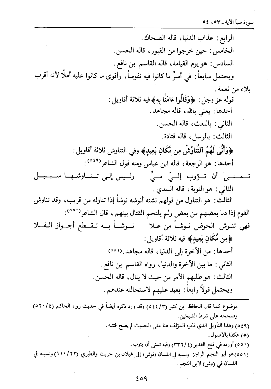 الرابع: عذاب الدنيا , قاله الضحاك. الخامس: حين خرجوا من القبور , قاله الحسن. السادس: هو يوم القيامة , قاله القاسم بن نافع. ويحتمل سابعاً: في أسرِّ ما كانوا فيه نفوساً , وأقوى ما كانوا عليه أملاً لأنه أقرب بلاء من نعمه. قوله عز وجل: {وَقَالُواءَامَنَّا بِهِ} فيه ثلاثة أقاويل: أحدها: يعني بالله , قاله مجاهد. الثاني: بالبعث , قاله الحسن. الثالث: بالرسل , قاله قتادة. {وَأَنَّى لَهُمُ التَّنَاوُشُ مِن مَّكَانِ بَعِيدٍ} وفي التناوش ثلاثة أقاويل: أحدها: هو الرجعة , قاله ابن عباس ومنه قول الشاعر: