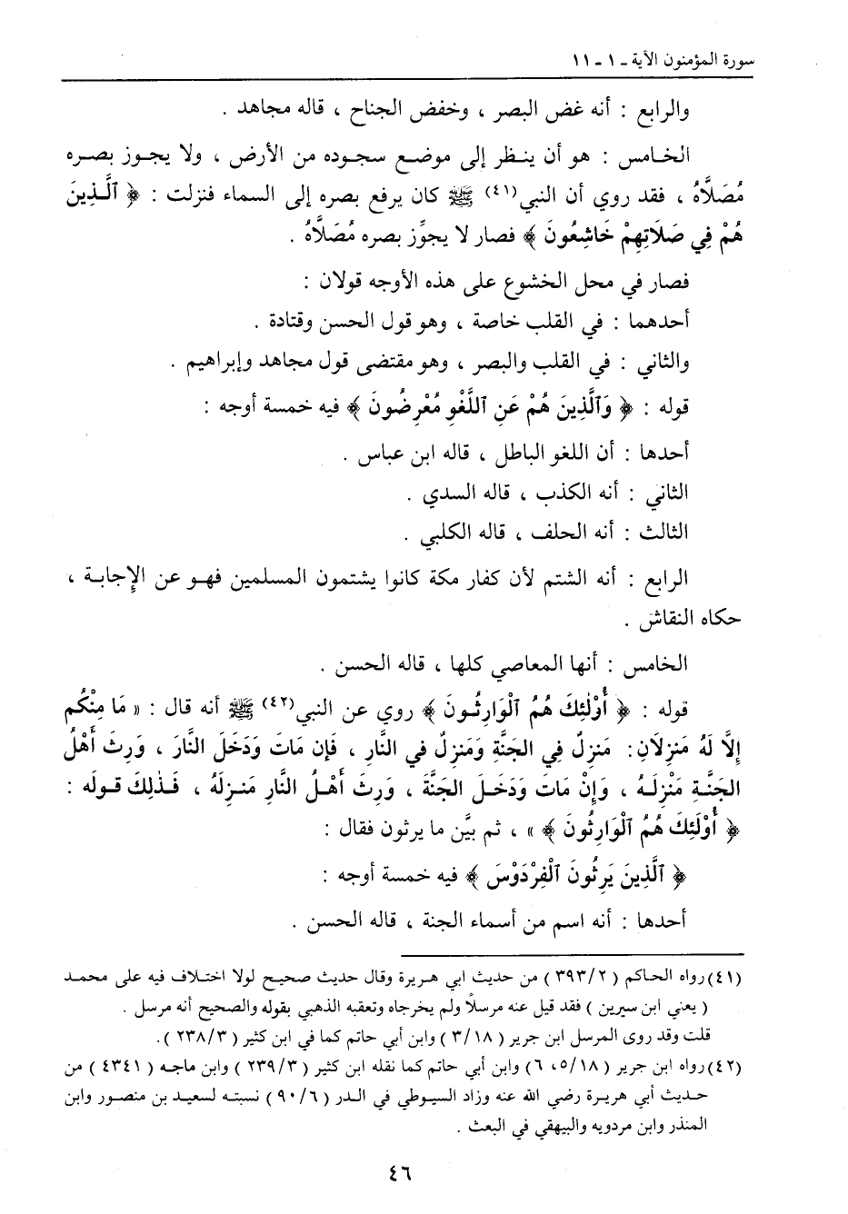 والرابع: أنه غض البصر، وخفض الجناح، قاله مجاهد. الخامس: هو أن ينظر إلى موضع سجوده من الأرض، ولا يجوز بصره مُصَلاَّهُ، فقد روي أن النبي صلى الله عليه وسلم كان يرفع بصره إلى السماء فنزلت: {الَّذِينَ هُمْ فِي صَلاَتِهِمْ خَاشِعُونَ} فصار لا يجوِّز بصره مُصَلاَّهُ. فصار في محل الخشوع على هذه الأوجه قولان: أحدهما: في القلب خاصة , وهو قول الحسن وقتادة. والثاني: في القلب والبصر , وهو قول الحسن وقتادة. قوله: {وَالَّذِينَ هُمْ عَنِ اللَّغْوِ مُعْرِضُونَ} فيه خمسة أوجه: أحدها: أن اللغو الباطل , قاله ابن عباس. الثاني: أنه الكذب , قاله ابن عباس. الثالث: أنه الحلف , قاله الكلبي. الرابع: أنه الشتم لأن كفار مكة كانوا يشتمون المسلمين فهو عن الإِجابة , حكاه النقاش. الخامس: أنها المعاصي كلها، قاله الحسن.