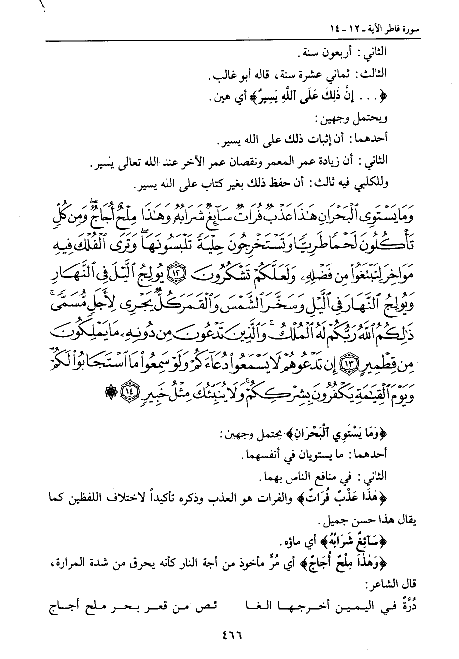 {وما يستوي البحران هذا عذب فرات سائغ شرابه وهذا ملح أجاج ومن كل تأكلون لحما طريا وتستخرجون حلية تلبسونها وترى الفلك فيه مواخر لتبتغوا من فضله ولعلكم تشكرون يولج الليل في النهار ويولج النهار في الليل وسخر الشمس والقمر كل يجري لأجل مسمى ذلكم الله ربكم له الملك والذين تدعون من دونه ما يملكون من قطمير إن تدعوهم لا يسمعوا دعاءكم ولو سمعوا ما استجابوا لكم ويوم القيامة يكفرون بشرككم ولا ينبئك مثل خبير} {وَمَا يَسْتَوِي الْبَحْرَانِ} يحتمل وجهين: أحدهما: ما يستويان في أنفسهما. الثاني: في منافع الناس بهما. {هذَا عَذْبٌ فُراتٌ} والفرات هو العذب وذكره تأكيداً لاختلاف اللفظين كما يقال هذا حسن جميل. {سَآئَغٌ شَرَابُهُ} أي ماؤه. {وَهذا مِلْحٌ أُجَاجٌ} أي مُرٌّ مأخوذ من أجة النار كأنه يحرق من شدة المرارة , قال الشاعر: