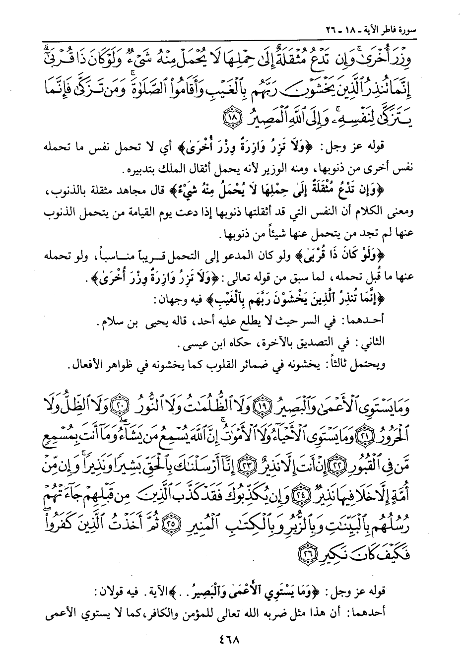 وزر أخرى وإن تدع مثقلة إلى حملها لا يحمل منه شيء ولو كان ذا قربى إنما تنذر الذين يخشون ربهم بالغيب وأقاموا الصلاة ومن تزكى فإنما يتزكى لنفسه وإلى الله المصير} قوله عز وجل: {وَلاَ تَزِرُ وَازِرَةٌ وِزْرَ أخْرَى} أي لا تحمل نفس ما تحمله نفس أخرى من ذنوبها , ومنه الوزير لأنه يحمل أثقال الملك بتدبيره. {وَإن تَدَعُ مُثْقَلَةٌ إلَى حِمْلِهَا لاَ يُحْمَل مِنْهُ شَيْءٌ} قال مجاهد مثقلة بالذنوب , ومعنى الكلام أن النفس التي قد أثقلتها ذنوبها إذا دعت يوم القيامة من يتحمل الذنوب عنها لم تجد من يتحمل عنها شيئاً من ذنوبها. {وَلَوْ كَانَ ذَا قُرْبَى} ولو كان المدعو إلى التحمل قريباً مناسباً , ولو تحمله عنها ما قُبل تحمله , لما سبق من قوله تعالى: {وَلاَ تَزِرُ وَازِرَةٌ وِزْرَ أُخْرَى}. {إنَّمَا تُنذِرُ الَّذِينَ يَخْشَوْنَ رَبَّهَم بِالْغَيْبِ} فيه وجهان: أحدهما: في السر حيث لا يطلع عليه أحد , قاله يحيى بن سلام. الثاني: في التصديق بالآخرة , حكاه ابن عيسى. ويحتمل ثالثاً: يخشونه في ضمائر القلوب كما يخشونه في ظواهر الأفعال.