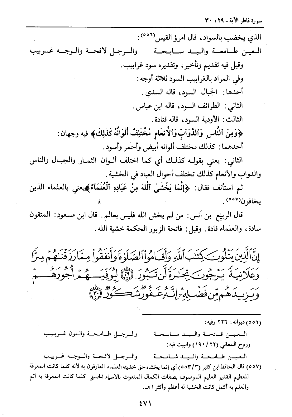 وقيل فيه تقديم وتأخير , وتقديره سود غرابيب. وفي المراد بالغرابيب السود ثلاثة أوجه: أحدها: الجبال السود , قاله السدي. الثاني: الطرائف السود , قاله ابن عباس. الثالث: الأودية السود , قاله قتادة. {وَمِنَ النَّاسِ وَالدَّوآبِّ وَالأَنعَامِ مُخْتَلِفٌ أَلَوَانُهُ كَذلِكَ} فيه وجهان: أحدهما: كذلك مختلف ألوانه أبيض وأحمر وأسود. الثاني: يعني بقوله كذلك أي كما اختلف ألوان الثمار والجبال والناس والدواب والأنعام كذلك تختلف أحوال العباد في الخشية. ثم استأنف فقال: {إنَّمَا يَخْشَى اللَّهَ مِنْ عَبَادِهِ الْعُلَمَآءُ} يعني بالعلماء الذين يخافون. قال الربيع بن أنس: من لم يخش الله فليس بعالم. قال ابن مسعود: المتقون سادة , والعلماء قادة. وقيل: فاتحة الزبور الحكمة خشية الله.