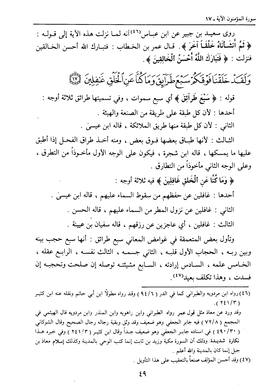{ولقد خلقنا فوقكم سبع طرائق وما كنا عن الخلق غافلين} قوله: {سَبْعَ طَرآئِقَ} أي سبع سموات , وفي تسميتها طرائق ثلاثة أوجه: أحدها: لأن كل طبقة على طريقة من الصنعة والهيئة. الثاني: لأن كل طبقة منها طريق الملائكة , قاله ابن عيسى. الثالث: لأنها طباق بعضها فوق بعض , ومنه أخذ طراق الفحل إذا أطبق عليها ما يمسكها , قاله ابن شجرة , فيكون على الوجه الأول مأخوذاً من التطرق , وعلى الوجه الثاني مأخوذاً من التطارق. {وَمَا كُنَّا عَنِ الْخَلقِ غَافِلِينَ} فيه ثلاثة أوجه: أحدها: غافلين عن حفظهم من سقوط السماء عليهم , قاله ابن عيسى. الثاني: غافلين عن نزول المطر من السماء عليهم , قاله الحسن. الثالث: غافلين , أي عاجزين عن رزقهم , قاله سفيان بن عيينة. وتأول بعض المتعمقة في غوامض المعاني سبع طرائق: أنها سبع حجب بينه وبين ربه، الحجاب الأول قلبه، الثاني جسمه، الثالث نفسه، الرابع عقله، الخامس علمه، السادس إرادته، السابع مشيئته توصله إن صلحت وتحجبه إن فسدت , وهذا تكلف بعيد.