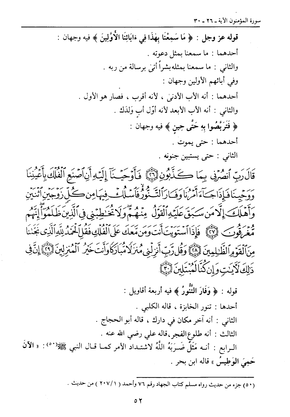 {قال رب انصرني بما كذبون فأوحينا إليه أن اصنع الفلك بأعيننا ووحينا فإذا جاء أمرنا وفار التنور فاسلك فيها من كل زوجين اثنين وأهلك إلا من سبق عليه القول منهم ولا تخاطبني في الذين ظلموا إنهم مغرقون فإذا استويت أنت ومن معك على الفلك فقل الحمد لله الذي نجانا من القوم الظالمين وقل رب أنزلني منزلا مباركا وأنت خير المنزلين إن في ذلك لآيات وإن كنا لمبتلين} قوله: {وَفَارَ التَّنُّورَ} فيه أربعة أقاويل: أحدها: تنور الخابزة , قاله الكلبي. الثاني: أنه آخر مكان في دارك , قاله أبو الحجاج. الثالث: أنه طلوع الفجر , قاله علي رضي الله عنه. الرابع: أنه مَثَلٌ ضَرَبَهُ اللَّهُ لاشتداد الأمر كما قال النبي صلى الله عليه وسلم: (الآن حَمِيَ الوَطِيسُ) قاله ابن بحر.