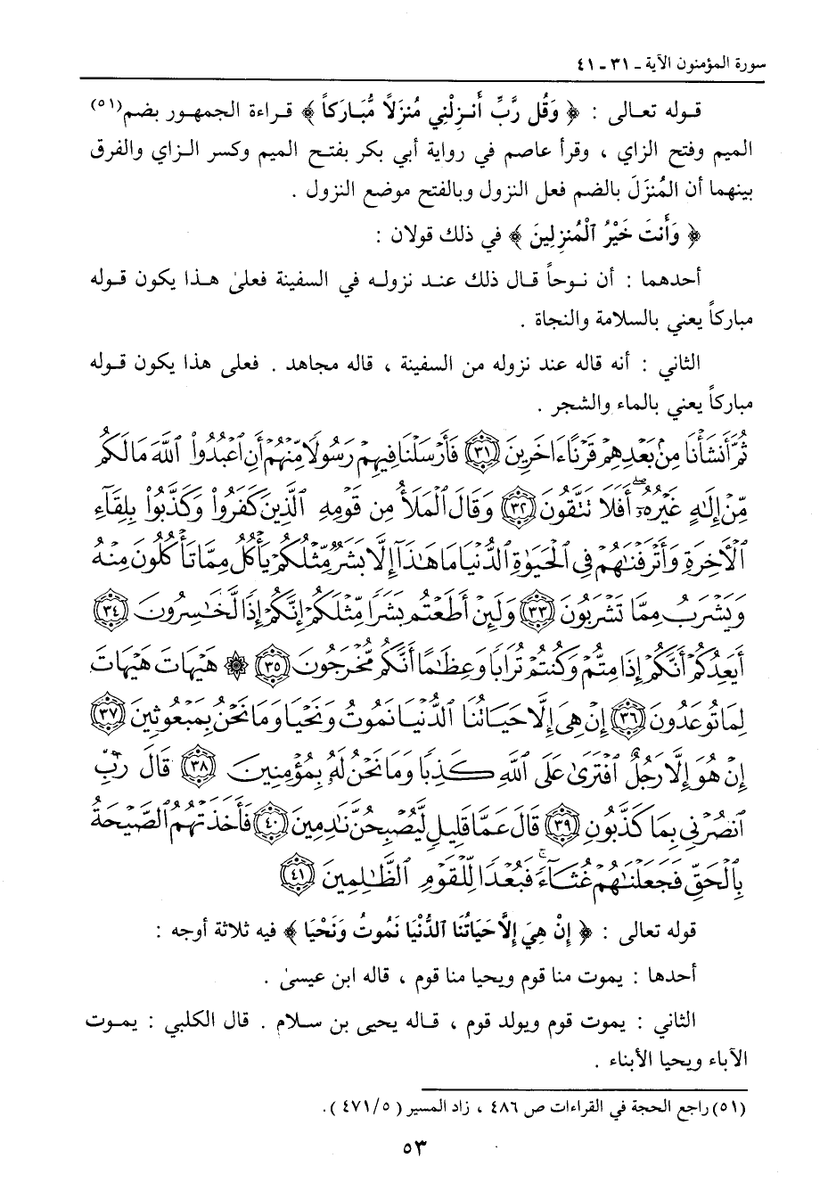 قوله تعالى: {وَقُل رَّبِّ أَنزِلْنِي مُنزَلاً مُّبَارَكاً} قراءة الجمهور بضم الميم وفتح الزاي , وقرأ عاصم في رواية بكر بفتح الميم وكسر الزاي والفرق بينهما أن المُنزَلَ بالضم فعل النزول وبالفتح موضع النزول. {وَأَنتَ خَيْرٌ الْمُنزِلِينَ} في ذلك قولان: أحدهما: أن نوحاً قال ذلك عند نزوله في السفينة فعلى هذا يكون قوله مباركاً يعني بالسلامة والنجاة. الثاني: أنه قاله عند نزوله من السفينة , قاله مجاهد. فعلى هذا يكون قوله مباركاً يعني بالماء والشجر.