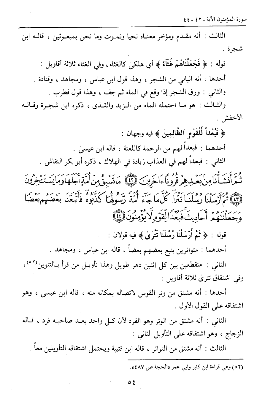 {ثم أنشأنا من بعدهم قرونا آخرين ما تسبق من أمة أجلها وما يستأخرون ثم أرسلنا رسلنا تترا كل ما جاء أمة رسولها كذبوه فأتبعنا بعضهم بعضا وجعلناهم أحاديث فبعدا لقوم لا يؤمنون} قوله: {ثَمَّ أَرْسَلْنَا رُسُلَنَا تَتْرَى} فيه قولان: أحدهما: متواترين يتبع بعضهم بعضاً , قاله ابن عباس , ومجاهد. الثاني: منقطعين بين كل اثنين دهر طويل وهذا تأويل من قرأ بالتنوين. وفي اشتقاق تترى ثلاثة أقاويل. أحدها: أنه مشتق من وتر القوس لاتصاله بمكانه منه , قاله ابن عيسى. وهو اشتقاقه على القول الأول. الثاني: أنه مشتق من الوتر وهو الفرد لأن كل واحد بعد صاحبه فرد , قاله الزجاج , وهو اشتقاقه على التأويل الثاني. الثالث: أنه مشتق من التواتر , قاله ابن قتيبة ويحتمل اشتقاقه التأويلين معاً.