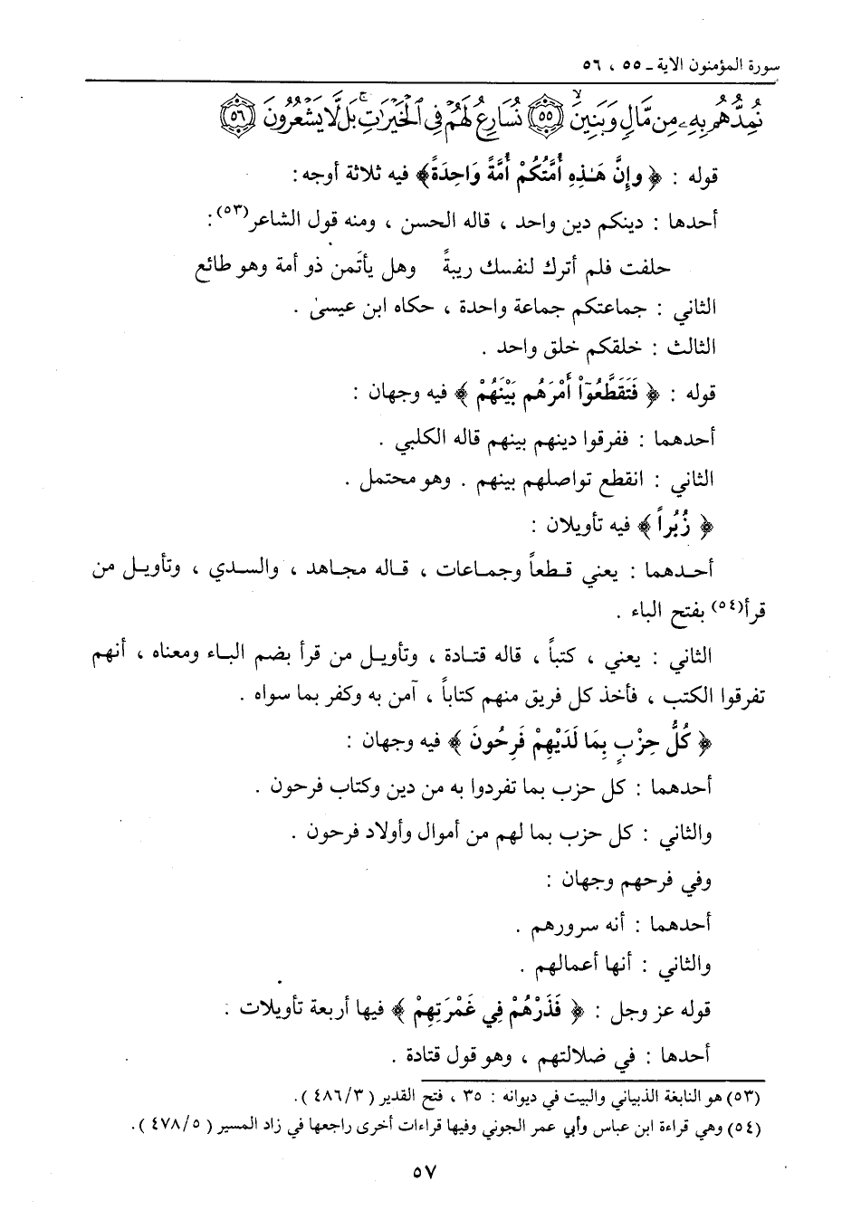 نمدهم به من مال وبنين نسارع لهم في الخيرات بل لا يشعرون} قوله: {وإِنَّ هَذِهِ أُمَّتُكُمْ أُمَّةً وَاحِدةً} فيه ثلاثة أوجه: أحدها: دينكم دين واحد , قاله الحسن , ومنه قول الشاعر: