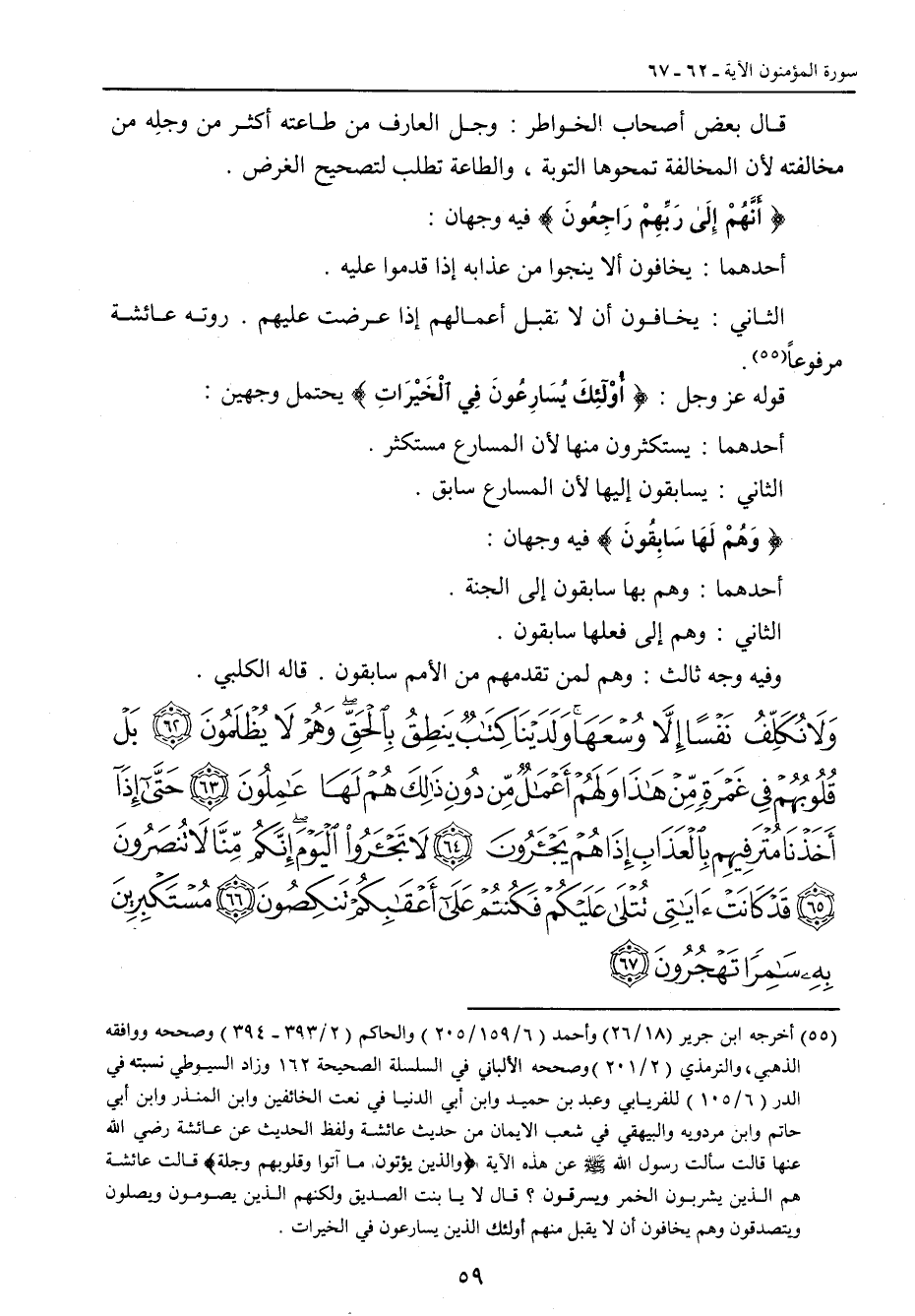 {ولا نكلف نفسا إلا وسعها ولدينا كتاب ينطق بالحق وهم لا يظلمون بل قلوبهم في غمرة من هذا ولهم أعمال من دون ذلك هم لها عاملون حتى إذا أخذنا مترفيهم بالعذاب إذا هم يجأرون لا تجأروا اليوم إنكم منا لا تنصرون قد كانت آياتي تتلى عليكم فكنتم على أعقابكم تنكصون مستكبرين به سامرا تهجرون}