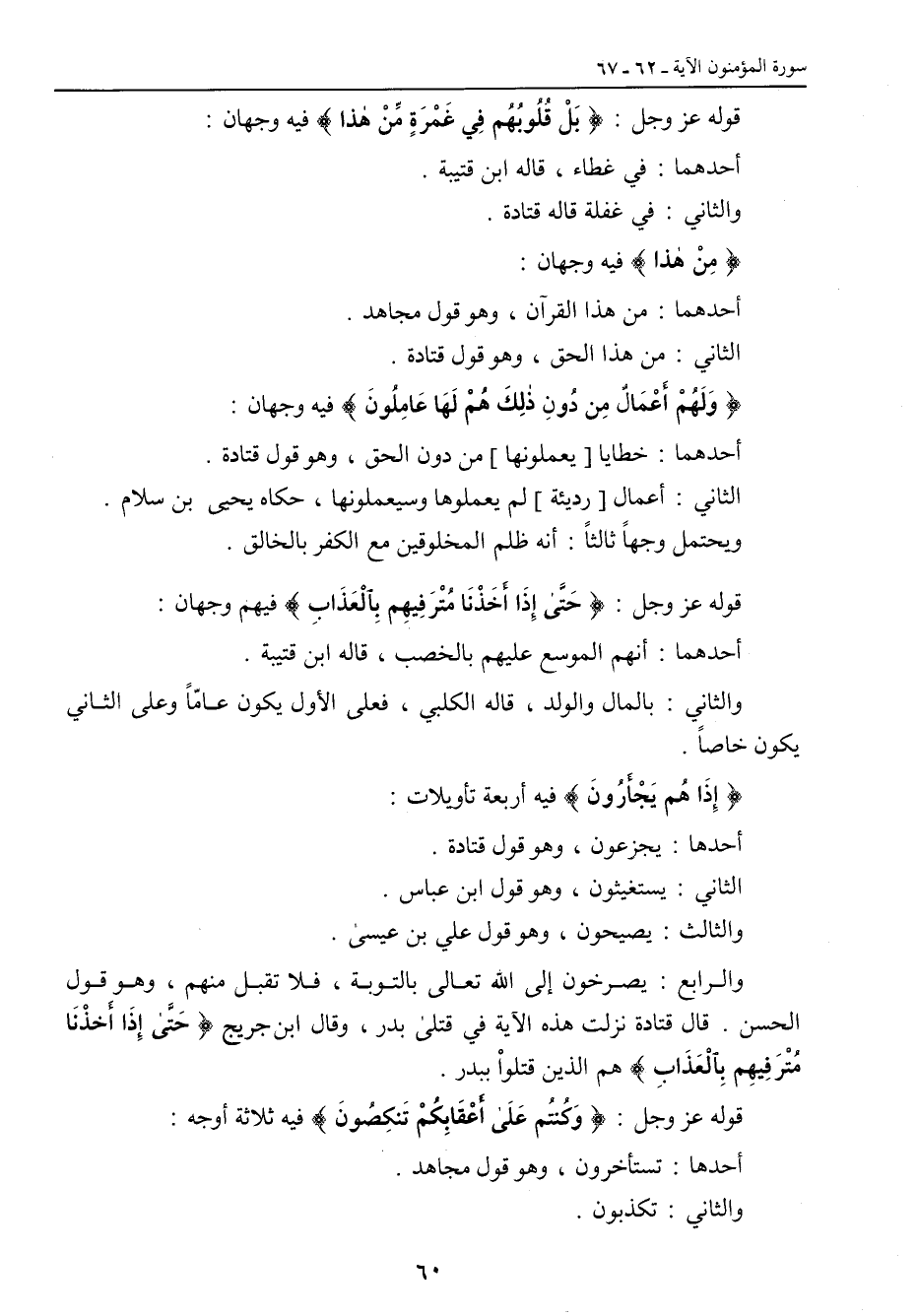 قوله عز وجل: {بَلْ قُلُوبُهُمْ فِي غَمرَةٍ مِّنْ هذا} فيه وجهان: أحدهما: في غطاء , قاله ابن قتيبة. والثاني: في غفلة قاله قتادة. {مِنْ هذا} فيه وجهان: أحدهما: من هذا القرآن , وهو قول مجاهد. الثاني: من هذا الحق , وهو قول قتادة. {وَلَهُمْ أَعْمَالٌ مِن دُونِ ذلِكَ هُمْ لَهَا عَامِلُونَ} فيه وجهان: أحدهما: خطايا [يعملونها] من دون الحق , وهو قول قتادة. الثاني: أعمال [رديئة] لم يعملوها وسيعملونها , حكاه يحيى ابن سلام. ويحتمل وجهاً ثالثاً: أنه ظلم المخلوقين مع الكفر بالخالق. قوله عز وجل: {حَتَّى إِذَا أَخَذْنَا مُتْرَفِيهِم بِالْغَذَابِ} فيهم وجهان: أحدهما: أنهم الموسع عليهم بالخصب , قاله ابن قتيبة. والثاني: بالمال والولد , قاله الكلبي , فعلى الأول يكون عامّاً وعلى الثاني يكون خاصاً. {إذَا هُم يَجْأَرُونَ} فيه أربعة تأويلات: أحدها: يجزعون , وهو قول قتادة. الثاني: يستغيثون , وهوقول ابن عباس. والثالث: يصيحون , وهو قول علي بن عيسى. والرابع: يصرخون إلى الله تعالى بالتوبة , فلا تقبل منهم , وهو قول الحسن. قال قتادة نزلت هذه الآية في قتلى بدر , وقال ابن جريج {حَتَّى إِذَا أَخذْنَا مُتْرَفِيهِم بِالْعَذَابِ} هم الذين قتلواْ ببدر. قوله عز وجل: {وَكُنتُم عَلَى أَعْقَابِكُمْ تَنكِصُونَ} فيه ثلاثة أوجه: أحدها: تستأخرون , وهو قول مجاهد. والثاني: تكذبون.