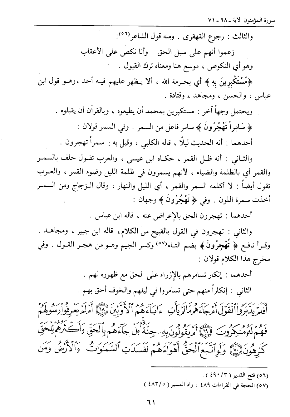 والثالث: رجوع القهقرى. ومنه قول الشاعر: زعموا أنهم على سبل الحق وأنا نكص على الأعقاب. وهو أي النكوص , موسع هنا ومعناه ترك القبول. {مُسْتَكْبِرِينَ بِهِ} أي بحرمة الله , ألا يظهر عليهم فيه أحد , وهو قول ابن عباس , والحسن , ومجاهد , وقتادة. ويحتمل وجهاً آخر: مستكبرين بمحمد أن يطيعوه , وبالقرآن أن يقبلوه. {سَامِراً تَهْجُرونَ} سامر فاعل من السمر. وفي السمر قولان: أحدهما: أنه الحديث ليلاً , قاله الكلبي , وقيل به: سمراً تهجرون. والثاني: أنه ظل القمر , حكاه ابن عيسى , والعرب تقول حلف بالسمر والقمر أي بالظلمة والضياء , لأنهم يسمرون في ظلمة الليل وضوء القمر , والعرب تقول أيضاً: لا أكلمه السمر والقمر , أي الليل والنهار , وقال الزجاج ومن السمر أخذت سمرة اللون. وفي {تَهْجُرُونَ} وجهان: أحدهما: تهجرون الحق بالإِعراض عنه , قاله ابن عباس. والثاني: تهجرون في القول بالقبيح من الكلام , قاله ابن جبير , ومجاهد. وقرأ نافع {تُهْجِرُونَ} بضم التاء وكسر الجيم وهو من هجر القول. وفي مخرج هذا الكلام قولان: أحدهما: إنكار تسامرهم بالإِزراء على الحق مع ظهوره لهم. الثاني: إنكاراً منهم حتى تسامروا في ليلهم والخوف أحق بهم.