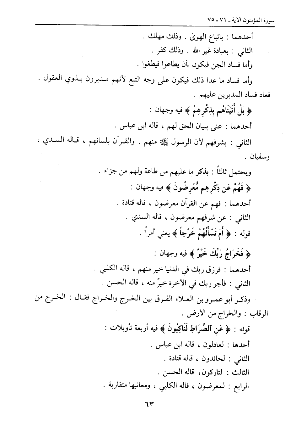 أحدهما: باتباع الهوى. وذلك مهلك. الثاني: بعبادة غير الله. وذلك كفر. وأما فساد الجن فيكون بأن يطاعوا فيطغوا. وأما فساد ما عدا ذلك فيكون على وجه التبع بأنهم مدبرون بذوي العقول. فعاد فساد المدبرين عليهم. {بَلْ أَتَيْنَاهُم بِذِكْرِهِمْ} فيه وجهان: أحدهما: عنى ببيان الحق لهم , قاله ابن عباس. الثاني: بشرفهم لأن الرسول صلى الله عليه وسلم منهم. والقرآن بلسانهم , قاله السدي , وسفيان. ويحتمل ثالثاً: بذكر ما عليهم من طاعة ولهم من جزاء. {فَهُمْ عَن ذِكْرِهِم مُّعِرِضُونَ} فيه وجهان: أحدهما: فهم عن القرآن معرضون , قاله قتادة. الثاني: عن شرفهم معرضون , قاله السدي. قوله: {أَمْ تَسْأَلُهُمْ خَرْجاً} يعني أمراً. {فَخَرَاجُ رَبِّكَ خَيْرٌ} فيه وجهان: أحدهما: فرزق ربك في الدنيا خير منهم , قاله الكلبي. الثاني: فأجر ربك في الآخرة خيرٌ منه , قاله الحسن. وذكر أبو عمرو بن العلاء الفرق بين الخرج والخراج فقال: الخرج من الرقاب: والخراج من الأرض. قوله: {عَنِ الصِّرَاطِ لَنَاكِبُونَ} فيه أربعة تأويلات: أحدها: لعادلون , قاله ابن عباس. الثاني: لحائدون , قاله قتادة. الثالث: لتاركون , قاله الحسن. الرابع: لمعرضون , قاله الكلبي , ومعانيها متقاربة.