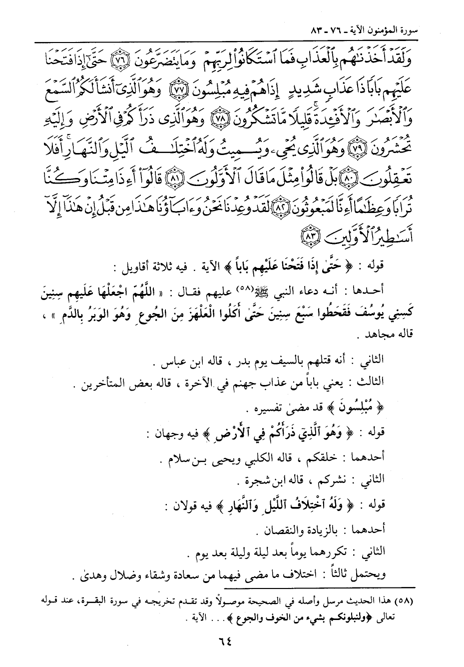 {ولقد أخذناهم بالعذاب فما استكانوا لربهم وما يتضرعون حتى إذا فتحنا عليهم بابا ذا عذاب شديد إذا هم فيه مبلسون وهو الذي أنشأ لكم السمع والأبصار والأفئدة قليلا ما تشكرون وهو الذي ذرأكم في الأرض وإليه تحشرون وهو الذي يحيي ويميت وله اختلاف الليل والنهار أفلا تعقلون بل قالوا مثل ما قال الأولون قالوا أئذا متنا وكنا ترابا وعظاما أئنا لمبعوثون لقد وعدنا نحن وآباؤنا هذا من قبل إن هذا إلا أساطير الأولين} قوله: {حَتَّى إِذَا فَتَحْنَا عَلَيْهِم بَاباً} الآية. فيه ثلاثة أقاويل: أحدها: أنه دعاء النبي صلى الله عليه وسلم عليه فقال: (اللَّهُمّ اجْعَلْهَا عَلَيهِم سِنِينَ كَسِنِي يُوسُفَ فَقَحَطُوا سَبْعَ سِنِينَ حَتَّى أَكَلُوا الْعَلْهَزَ مِنَ الجُوعِ وَهُوَ الوَبَرُ بالدَّمِ) قاله مجاهد. الثاني: أنه قتلهم بالسيف يوم بدر , قاله ابن عباس. الثالث: يعني باباً من عذاب جهنم في الآخرة , قاله بعض المتأخرين. {مُبْلِسُونَ} قد مضى تفسيره. قوله: {وَهُوَ الَّذِي ذَرَأَكُمْ فِي الأَرْضِ} فيه وجهان: أحدهما: خلقكم , قاله الكلبي ويحيى بن سلام. الثاني: نشركم , قاله ابن شجرة. قوله: {وَلَهُ اخْتِلاَفُ اللَّيْلِ وَالنَّهَارِ} فيه قولان: أحدهما: بالزيادة والنقصان. الثاني: تكررهما يوماً بعد ليلة وليلة بعد يوم. ويحتمل ثالثاً: اختلاف ما مضى فيهما من سعادة وشقاء وضلال وهدى.