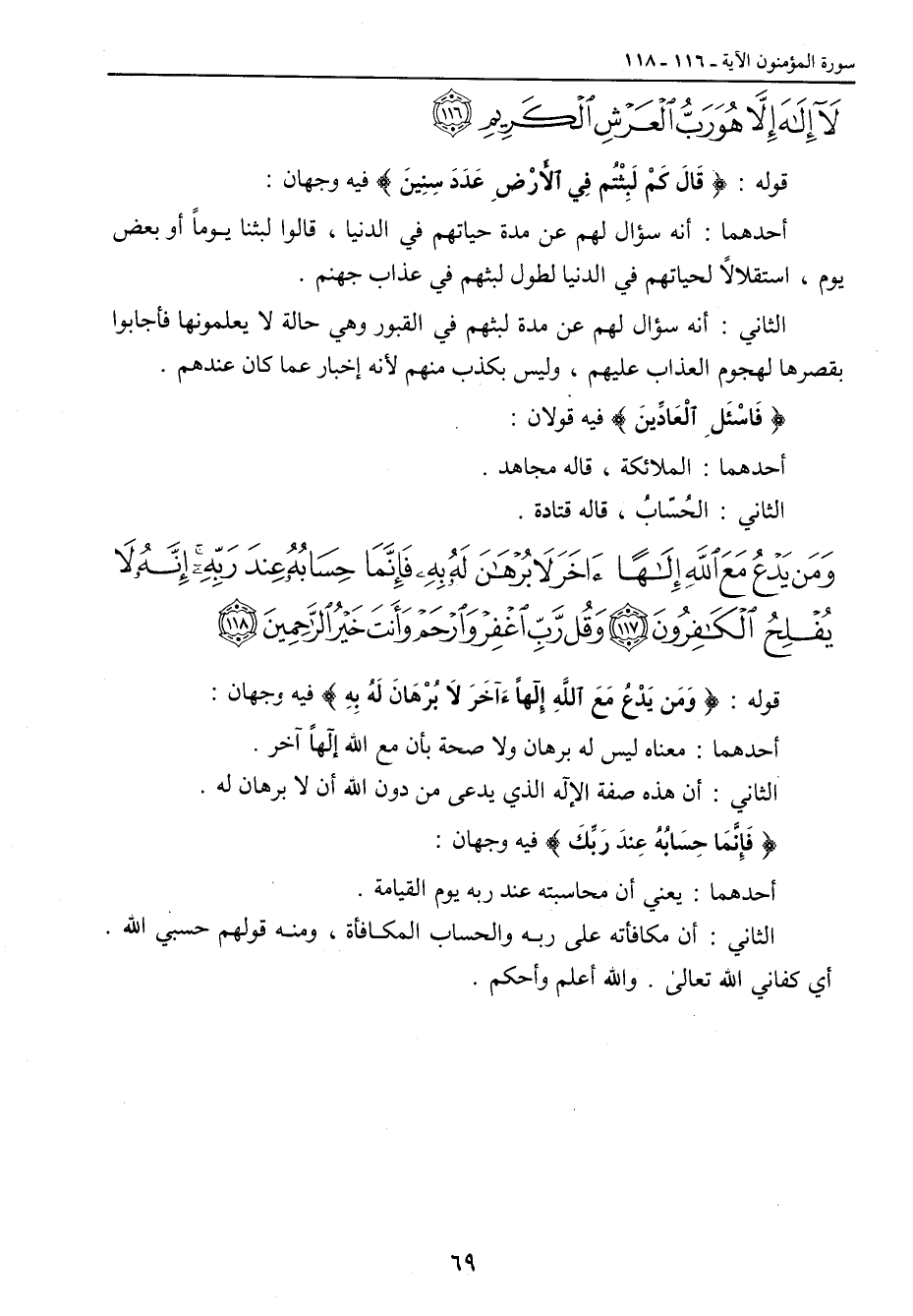 لا إله إلا هو رب العرش الكريم} قوله: {قَالَ كَمْ لَبِثْتُم فِي الأَرْضِ عَدَدَ سِنِينَ} فيه وجهان: أحدهما: أنه سؤال لهم من مدة حياتهم في الدنيا , قالوا لبثنا يوماً أو بعض يوم , استقلالاً لحياتهم في الدنيا لطول لبثهم في عذاب جهنم. الثاني: أنه سؤال لهم عن مدة لبثهم في القبور وهي حالة لا يعلمونها فأجابوا بقصرها لهجوم العذاب عليهم , وليس بكذب منهم لأنه إخبار عما كان عندهم. {فَاسْئَلِ الْعَادِّينَ} فيه قولان: أحدهما: الملائكة , قاله مجاهد. الثاني: الحُسّابُ , قاله قتادة.