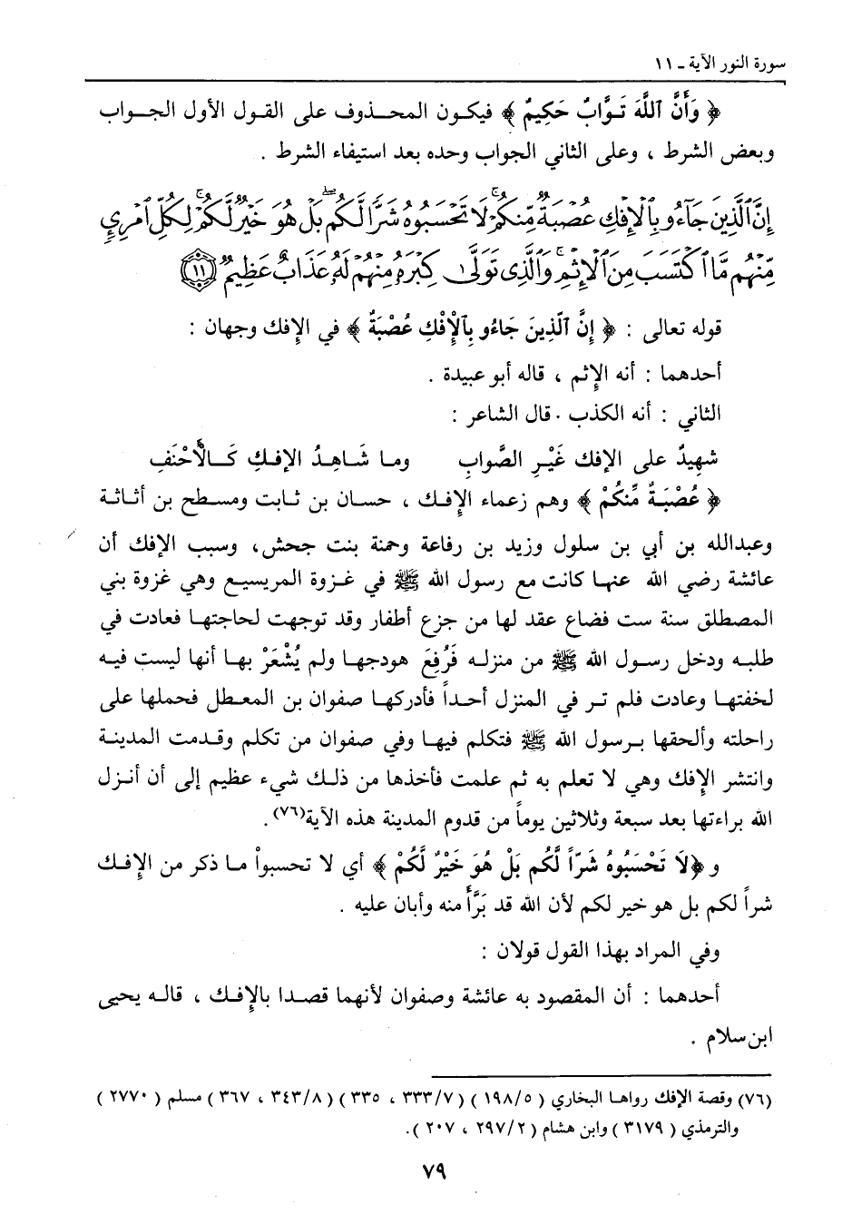 {عُصْبَةٌ مِّنكُمْ} وهم زعماء الإِفك , حسان بن ثابت ومسطح بن أثاثة وعبد الله بن أبي بن سلول وزيد بن رفاعة وحمنة بنت جحش , وسبب الإفك أن عائشة رضي الله عنها كانت مع رسول الله صلى الله عليه وسلم في غزوة المريسيع وهي غزوة بني المصطلق سنة ست فضاع عقد لها من جزع أطفار وقد توجهت لحاجتها فعادت في طلبه ودخل رسول الله صلى الله عليه وسلم من منزله فَرُفِعَ هودجها ولم يُشْعَرْ بها أنها ليست فيه لخفتها وعادت فلم تر في المنزل أحداً فأدركها صفوان بن المعطل فحملها على راحلته وألحقها برسول الله صلى الله عليه وسلم فتكلم فيها وفي صفوان من تكلم وقدمت المدينة وانتشر الإِفك وهي لا تعلم به ثم علمت فأخذها من ذلك شيء عظيم إلى أن أنزل الله براءتها بعد سبعة وثلاثين يوماً من قدوم المدينة هذه الآية. و {لاَ تَحْسَبُوهُ شَرّاً لَّكُم بَلْ هُوَ خَيْرٌ لَّكُمْ} أي لا تحسبواْ ما ذكر من الإِفك شراً لكم بل هو خير لكم لأن الله قد بَرَّاً منه وأبان عليه. وفي المراد بهذا القول قولان: أحدهما: أن المقصود به عائشة وصفوان لأنهما قصدا بالإِفك , قاله يحيى ابن سلام.