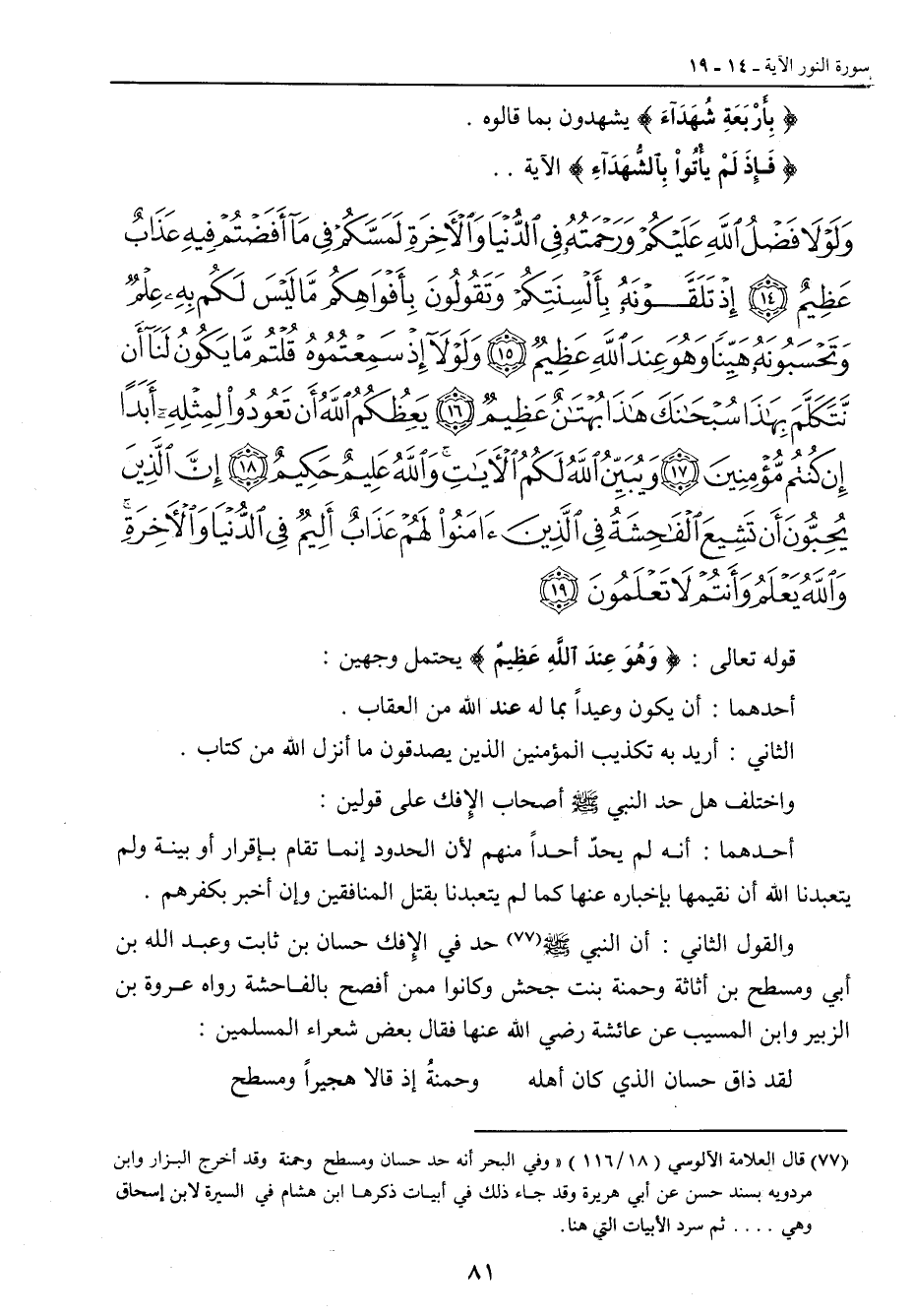 {ولولا فضل الله عليكم ورحمته في الدنيا والآخرة لمسكم فيما أفضتم فيه عذاب عظيم إذ تلقونه بألسنتكم وتقولون بأفواهكم ما ليس لكم به علم وتحسبونه هينا وهو عند الله عظيم ولولا إذ سمعتموه قلتم ما يكون لنا أن نتكلم بهذا سبحانك هذا بهتان عظيم يعظكم الله أن تعودوا لمثله أبدا إن كنتم مؤمنين ويبين الله لكم الآيات والله عليم حكيم إن الذين يحبون أن تشيع الفاحشة في الذين آمنوا لهم عذاب أليم في الدنيا والآخرة والله يعلم وأنتم لا تعلمون} قوله تعالى: {وَهُوَ عِندَ اللَّهِ عَظِيمٌ} يحتمل وجهين: أحدهما: أن يكون وعيداً بما له عند الله من العقاب. الثاني: أريد به تكذيب المؤمنين الذي يصدقون ما أنزل الله من كتاب. واختلف هل حد النبي صلى الله عليه وسلم أصحاب الإِفك على قولين: أحدهما: أنه لم يحدّ أحداً منهم لأن الحدود إنما تقام بإقرار أو بينة ولم يتعبدنا الله أن نقيمها بإخباره عنها كما لم يتعبدنا بقتل المنافقين وإن أخبر بكفرهم. والقول الثاني: أن النبي صلى الله عليه وسلم حد في الإِفك حسان بن ثابت وعبد الله بن أبي ومسطح بن أثاثة وحمنة بنت حجش وكانوا ممن أفصح بالفاحشة رواه عروة بن الزبير وابن المسيب عن عائشة رضي الله عنها فقال بعض شعراء المسلمين: