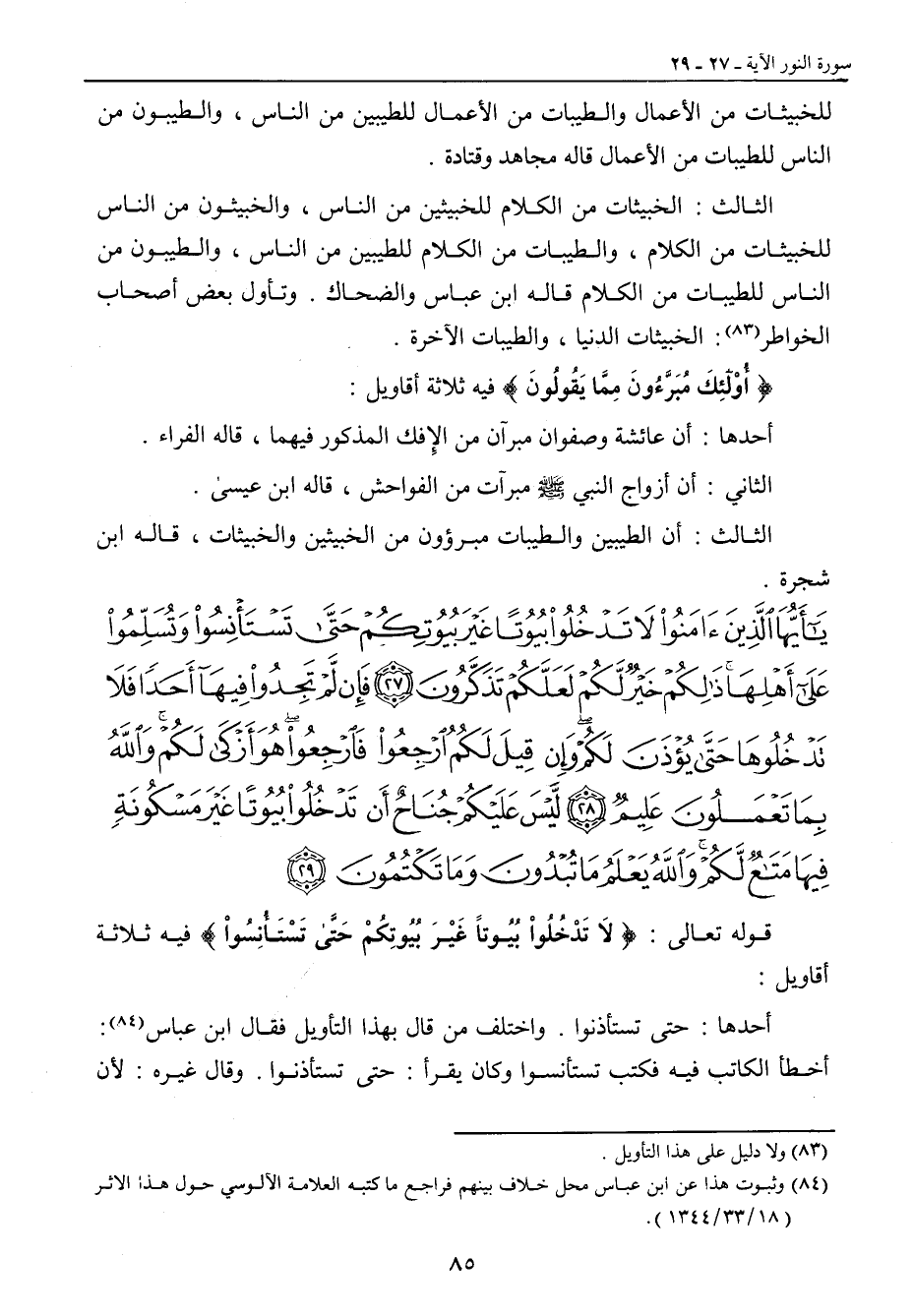 {يا أيها الذين آمنوا لا تدخلوا بيوتا غير بيوتكم حتى تستأنسوا وتسلموا على أهلها ذلكم خير لكم لعلكم تذكرون فإن لم تجدوا فيها أحدا فلا تدخلوها حتى يؤذن لكم وإن قيل لكم ارجعوا فارجعوا هو أزكى لكم والله بما تعملون عليم ليس عليكم جناح أن تدخلوا بيوتا غير مسكونة فيها متاع لكم والله يعلم ما تبدون وما تكتمون} قوله تعالى: {لاَ تَدْخُلُواْ بُيُوتاً غَيْر بُيُوتِكُمْ حَتَّى تَسْتَأُنِسُواْ} فيه ثلاثة أقاويل: أحدها: حتى تستأذنوا. واختلف من قال بهذا التأويل فقال ابن عباس: أخطأ الكاتب فيه فكتب تستأنسوا وكان يقرأ: حتى تستأذنوا. وقال غيره: لأن