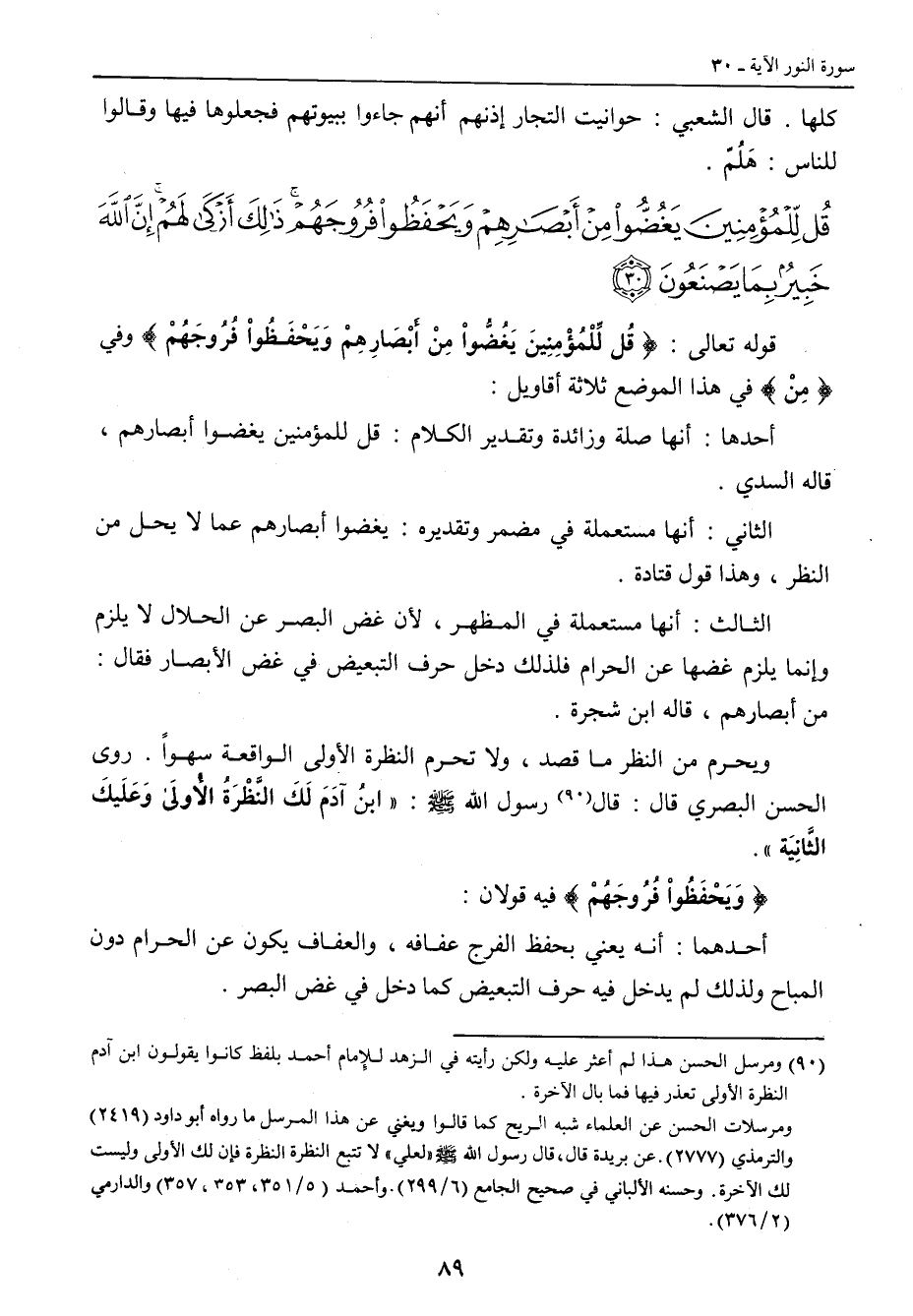{قل للمؤمنين يغضوا من أبصارهم ويحفظوا فروجهم ذلك أزكى لهم إن الله خبير بما يصنعون} قوله تعالى: {قُل لِّلْمُؤْمِنِينَ يَغُضُّواْ مِنْ أَبْصَارِهِمْ وَيَحْفَظُواْ فُرُوجَهُمْ} وفي {مِنْ} في هذا الموضع ثلاثة أقوايل: أحدها: أنها صلة وزائدة وتقدير الكلام: قل للمؤمنين يغضوا أبصارهم , قاله السدي. الثاني: أنها مستعملة في مضمر وتقديره , يغضوا أبصارهم عما لا يحل من النظر , وهذا قول قتادة. الثالث: أنها مستعملة في المظهر , لأن غض البصر عن الحلال لا يلزم وإنما يلزم غضها عن الحرام فلذلك دخل حرف التبعيض في غض الأبصار فقال: من أبصارهم , قاله ابن شجرة. ويحرم من النظر ما قصد , ولا تحرم النظرة الأولى الواقعة سهواً. روى الحسن البصري قال: قال رسول الله صلى الله عليه وسلم: (ابنُ آدَمَ لَكَ النَّظْرَةُ الأَولَى وَعَلَيكَ الثَّانِيَة). {وَيَحْفَظُواْ فُرُوجَهُمْ} فيه قولان: أحدهما: أنه يعني بحفظ الفرج عفافه، والعفاف يكون عن الحرام دون المباح ولذلك لم يدخل فيه حرف التبعيض كما دخل غض البصر.