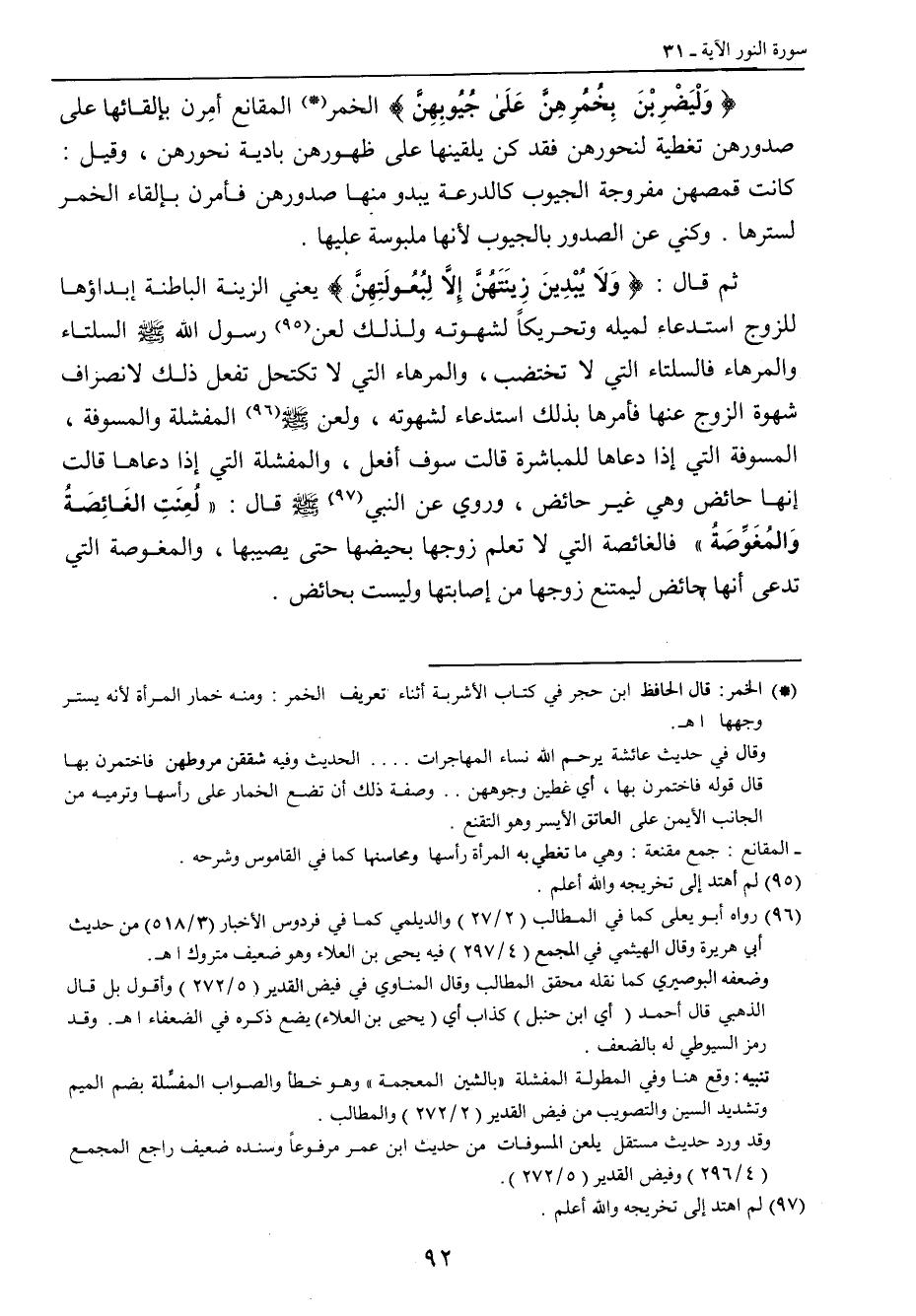 {وَلْيَضْرِبْنَ بِخُمُرِهِنَّ عَلَى جُيُوبِهنَّ} الخمر المقانع أمِرن بإلقائها على صدورهن تغطية لنحورهن فقد كن يلقينها على ظهورهن بادية نحورهن، وقيل: كانت قمصهن مفروجة الجيوب كالدرعة يبدو منها صدروهن فأمرن بإلقاء الخمر لسترها. وكني عن الصدور بالجيوب لأنها ملبوسة عليها. ثم قال: {وَلاَ يُبْدِينَ زِينَتَهُنَّ إِلاَّ لِبُعُولَتِهِنَّ} يعني الزينة الباطنة إبداؤها للزوج استدعاء لميله وتحريكاً لشهوته ولذلك لعن رسول الله صلى الله عليه وسلم السلتاء والمرهاء فالسلتاء التي لا تختضب، والمرهاء التي لا تكتحل تفعل ذلك لانصراف شهوة الزوج عنها فأمرها بذلك استدعاء لشهوته، ولعن صلى الله عليه وسلم المفشلة والمسوفة، المسوفة التي إذا دعاها للمباشرة قالت سوف أفعل، والمفشلة التي إذا دعاها قالت إنها حائض وهي غير حائض , وروي عن النبي صلى الله عليه وسلم قال: (لُعِنَتِ الغَائِصَةُ وَالمُغَوِّصَةُ) فالغائصة التي لا تعلم زوجها بحيضها حتى يصيبها، والمغوصة التي تدعى أنها حائض ليمتنع زوجها من إصابتها وليست بحائض.