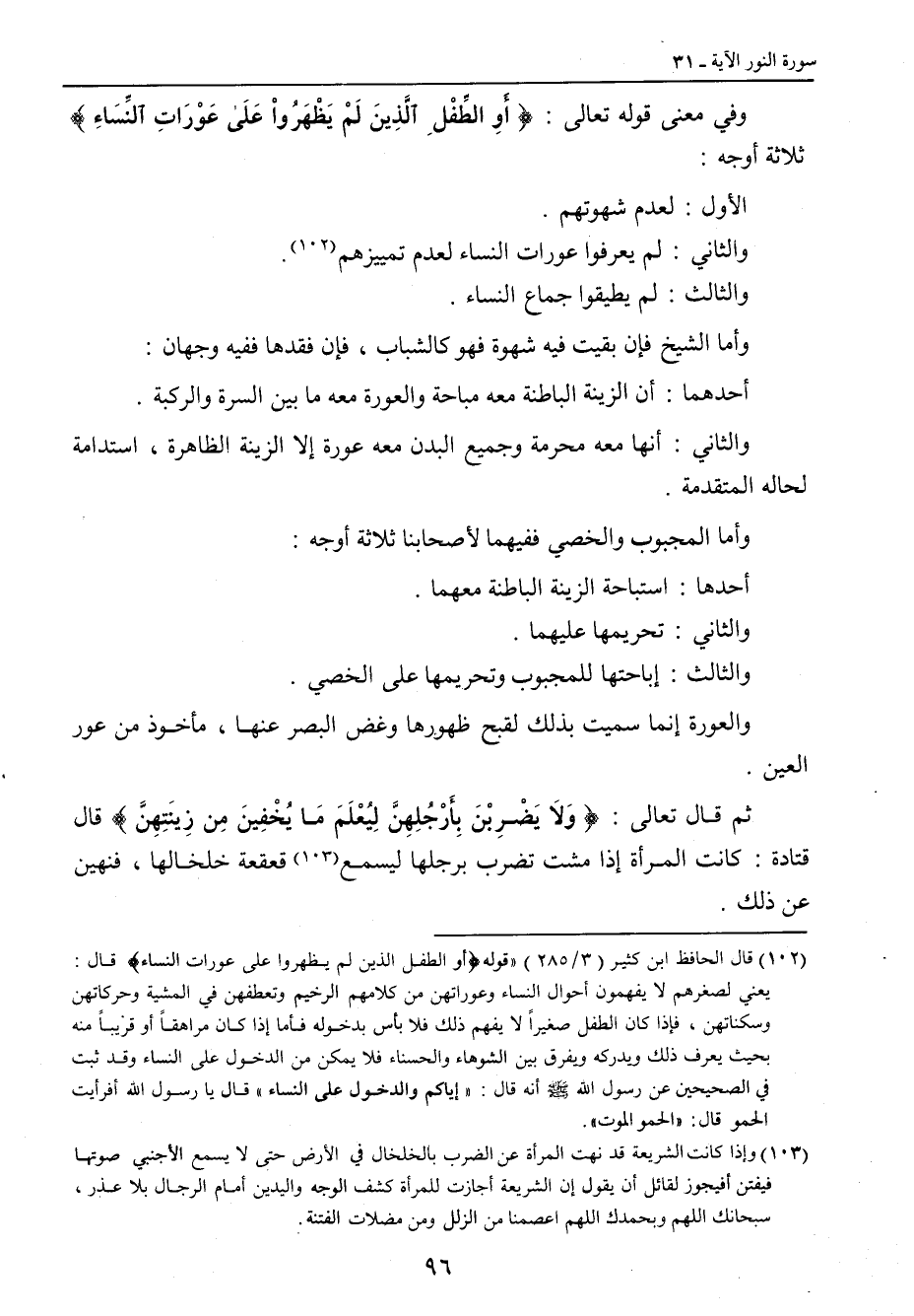 وفي معنى قوله تعالى: {أَوِ الطِّفْلِ الَّذِينَ لَمْ يَظْهَرُواْ عَلَى عَوْرَاتِ النِّسَاءِ} ثلاثة أوجه: الأول: لعدم شهوتهم. والثاني: لم يعرفوا عورات النساء لعدم تمييزهم. والثالث: لم يطيقوا جماع النساء. وأما الشيخ فإن بقيت فيه شهوة فهو كالشباب , فإن فقدها ففيه وجهان: أحدهما: أن الزينة الباطنة معه مباحة والعورة معه ما بين السرة والركبة. والثاني: أنها معه محرمة وجميع البدن معه عورة إلا الزينة الظاهرة، استدامة لحاله المتقدمة. وأما المجبوب والخصي ففيهما لأصحابنا ثلاثة أوجه: أحدها: استباحة الزينة الباطنة معهما. والثاني: تحريمها عليهما. والثالث: إباحتها للمجبوب وتحريمها على الخصي. والعورة إنما سميت بذلك لقبح ظهورها وغض البصر عنها، مأخوذ من عور العين. ثم قال تعالى: {وَلاَ يَضْرِبْنَ بِأَرْجُلِهِنَّ لِيُعْلَمَ مَا يُخْفِينَ مِن زِينَتِهِنَّ} قال قتادة: كانت المرأة إذا مشت تضرب برجلها ليسمع قعقعة خلخالها، فنهين عن ذلك.