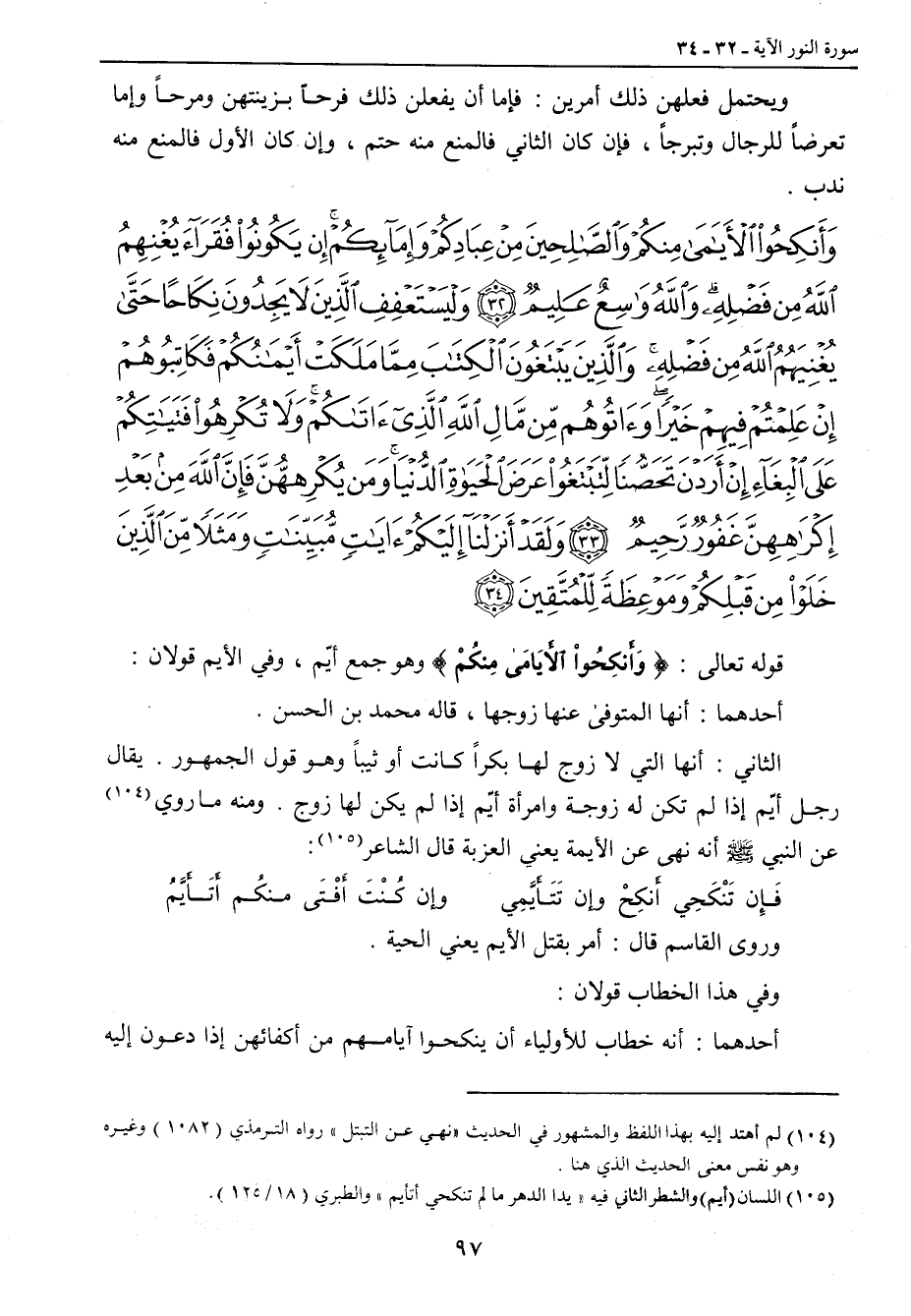{وأنكحوا الأيامى منكم والصالحين من عبادكم وإمائكم إن يكونوا فقراء يغنهم الله من فضله والله واسع عليم وليستعفف الذين لا يجدون نكاحا حتى يغنيهم الله من فضله والذين يبتغون الكتاب مما ملكت أيمانكم فكاتبوهم إن علمتم فيهم خيرا وآتوهم من مال الله الذي آتاكم ولا تكرهوا فتياتكم على البغاء إن أردن تحصنا لتبتغوا عرض الحياة الدنيا ومن يكرههن فإن الله من بعد إكراههن غفور رحيم ولقد أنزلنا إليكم آيات مبينات ومثلا من الذين خلوا من قبلكم وموعظة للمتقين} قوله تعالى: {وَأَنكِحُواْ الأَيَامَى مِنكُمْ} وهو جمع أيّم , وفي الأيم قولان: أحدهما: أنها المتوفى عنها زوجها , قاله محمد بن الحسن. الثاني: أنها التي لا زوج لها بكراً كانت أو ثيباً وهو قول الجمهور. يقال رجل أيّم إذا لم تكن له زوجة وامرأة أيّم إذا لم يكن لها زوج. ومنه ما روي عن النبي صلى الله عليه وسلم أنه نهى عن الأيمة يعني العزبة قال الشاعر: