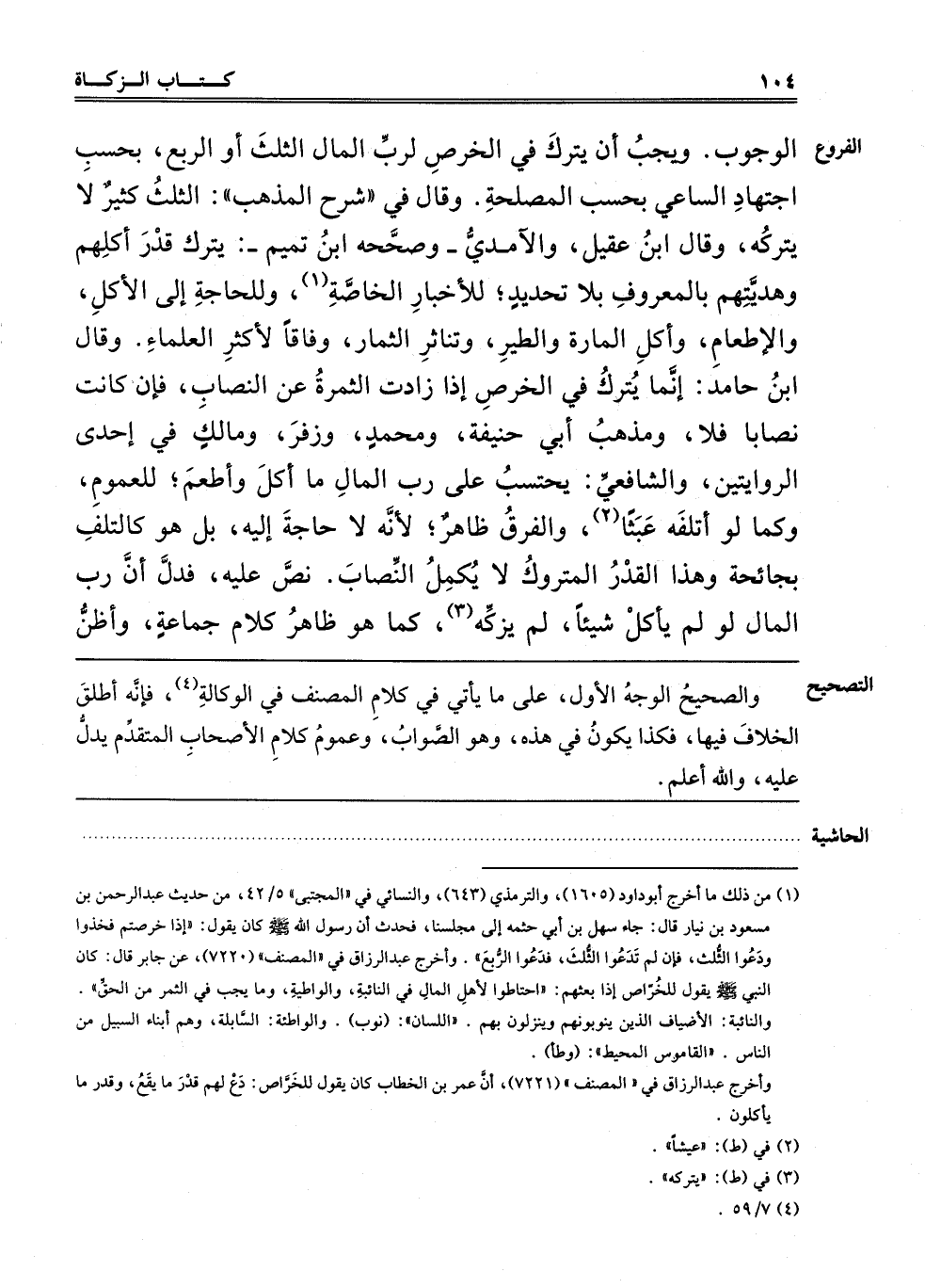 الْوُجُوبُ. وَيَجِبُ أَنْ يُتْرَكَ فِي الْخَرْصِ لِرَبِّ الْمَال الثُّلُثُ أَوْ الرُّبْعُ، بِحَسَبِ اجْتِهَادِ السَّاعِي، بِحَسَبِ الْمَصْلَحَةِ. وَقَالَ فِي شَرْحِ الْمَذْهَبِ: الثُّلُثُ كَثِيرٌ لَا يَتْرُكُهُ، وَقَالَ ابْنُ عَقِيلٍ وَالْآمِدِيُّ وَصَحَّحَهُ ابْنُ تَمِيمٍ يُتْرَكُ قَدْرُ أَكْلِهِمْ وَهَدِيَّتِهِمْ بِالْمَعْرُوفِ بِلَا تَحْدِيدٍ، لِلْأَخْبَارِ الْخَاصَّةِ1، وَلِلْحَاجَةِ إلَى الْأَكْلِ وَالْإِطْعَامِ وَأَكْلِ الْمَارَّةِ وَالطَّيْرِ وَتَنَاثُرِ الثِّمَارِ، وِفَاقًا لِأَكْثَرِ الْعُلَمَاءِ. وَقَالَ ابْنُ حَامِدٍ: إنَّمَا يُتْرَكُ فِي الْخَرْصِ إذَا زَادَتْ الثَّمَرَةُ عَنْ النِّصَابِ، فَإِنْ كَانَتْ نِصَابًا فَلَا، وَمَذْهَبُ أَبِي حَنِيفَةَ وَمُحَمَّدٍ وَزُفَرَ وَمَالِكٍ فِي إحْدَى الرِّوَايَتَيْنِ وَالشَّافِعِيِّ: يُحْتَسَبُ عَلَى رَبِّ الْمَالِ مَا أَكَلَ وأطعم، للعموم، وكما لو أتلفه عبثا2، وَالْفَرْقُ ظَاهِرٌ؛ لِأَنَّهُ لَا حَاجَةَ إلَيْهِ، بَلْ هُوَ كَالتَّلَفِ بِجَائِحَةٍ، وَهَذَا الْقَدْرُ الْمَتْرُوكُ لَا يَكْمُلُ بِهِ النِّصَابُ، نَصَّ عَلَيْهِ، فَدَلَّ أَنَّ رَبَّ الْمَالِ لَوْ لَمْ يَأْكُلْ شَيْئًا لَمْ يزكه3، كما هو ظاهر كلام جماعة، وأظن