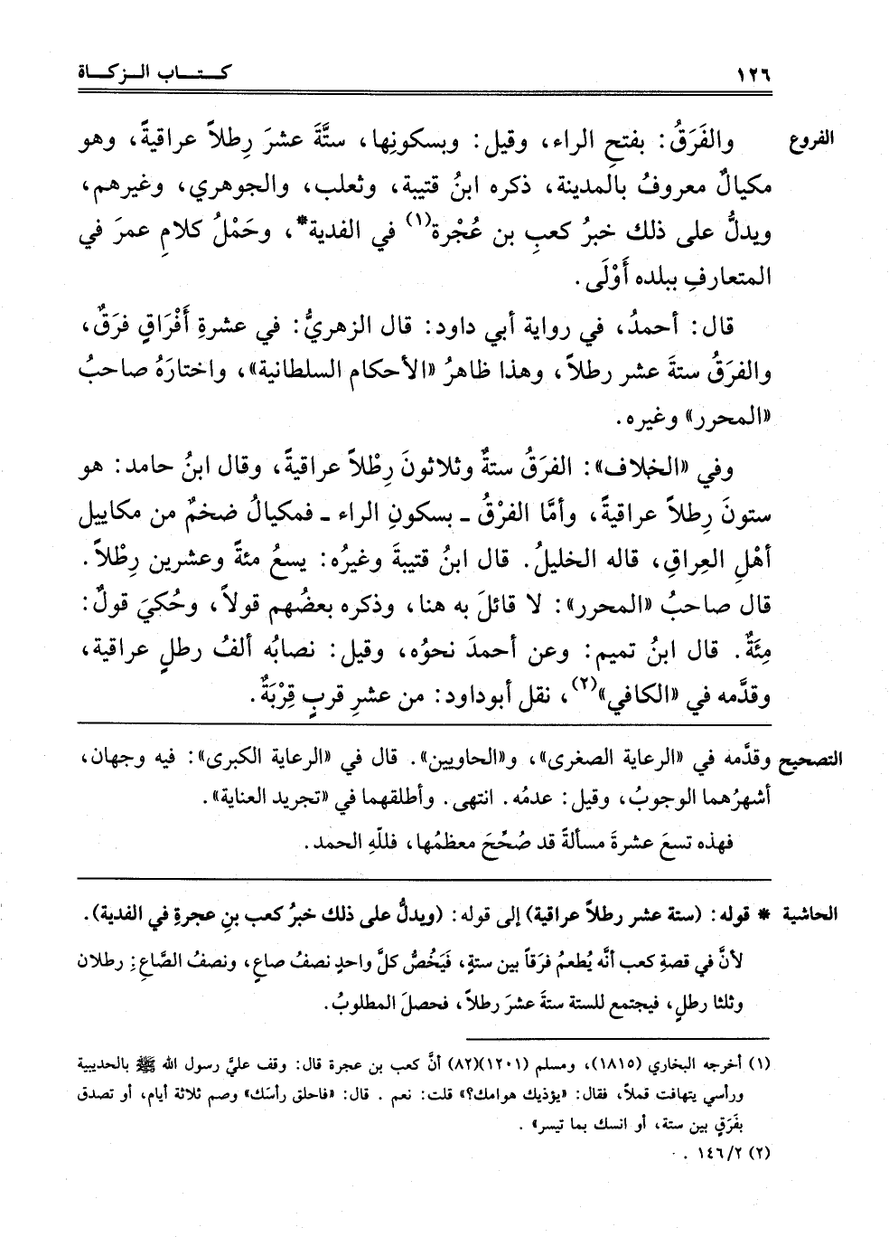 وَالْفَرَقُ، بِفَتْحِ الرَّاءِ، وَقِيلَ: وَبِسُكُونِهَا، سِتَّةَ عَشْرَ رِطْلًا عِرَاقِيَّةً، وَهُوَ مِكْيَالٌ مَعْرُوفٌ بِالْمَدِينَةِ، ذَكَرَهُ ابْنُ قُتَيْبَةَ وَثَعْلَبٌ وَالْجَوْهَرِيُّ وَغَيْرُهُمْ، وَيَدُلُّ عَلَى ذَلِكَ خَبَرُ كَعْبِ بْنِ عُجْرَةَ1 فِي الْفِدْيَةِ، وَحَمْلُ كَلَامِ عُمَرَ فِي الْمُتَعَارَفِ بِبَلَدِهِ أَوْلَى.