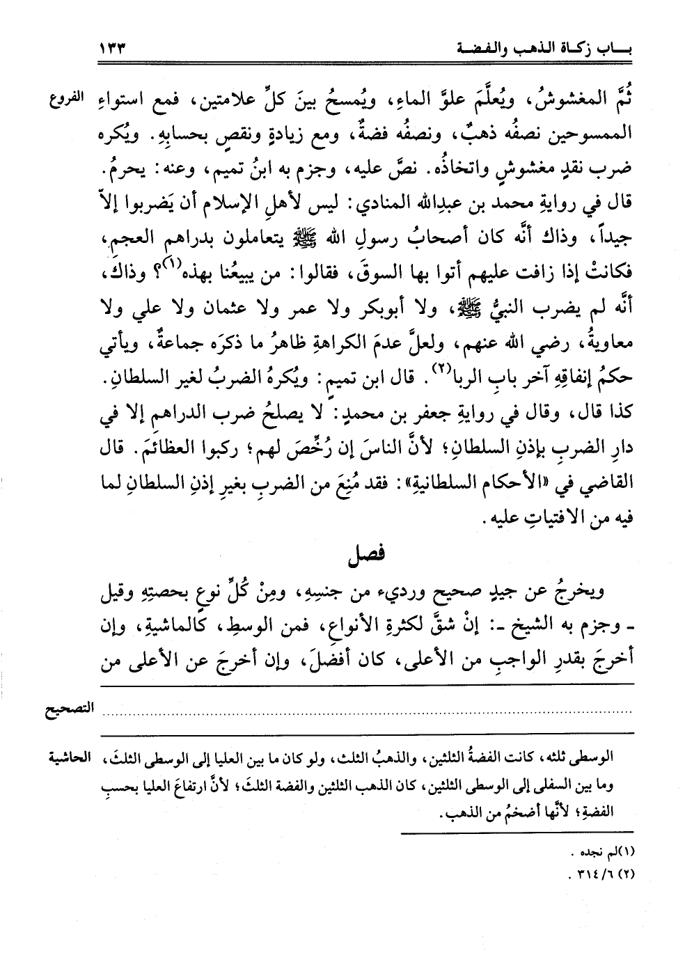 ثُمَّ الْمَغْشُوشُ، وَيُعْلَمُ عُلُوُّ الْمَاءِ، وَيُمْسَحُ بَيْنَ كُلِّ عَلَامَتَيْنِ فَمَعَ اسْتِوَاءِ الْمَمْسُوحَيْنِ نِصْفُهُ ذَهَبٌ، وَنِصْفُهُ فِضَّةٌ، وَمَعَ زِيَادَةٍ وَنَقْصٍ بِحِسَابِهِ. وَيُكْرَهُ ضَرْبُ نَقْدٍ مَغْشُوشٍ وَاِتِّخَاذُهُ، نَصَّ عَلَيْهِ، وَجَزَمَ بِهِ ابْنُ تَمِيمٍ، وَعَنْهُ: يَحْرُمُ، قَالَ فِي رِوَايَةِ مُحَمَّدِ بْنِ عَبْدِ اللَّهِ الْمُنَادِي: لَيْسَ لِأَهْلِ الْإِسْلَامِ أَنْ يَضْرِبُوا إلَّا جَيِّدًا، وَذَلِكَ أَنَّهُ كَانَ أَصْحَابُ رَسُولِ اللَّهِ صَلَّى اللَّهُ عَلَيْهِ وَسَلَّمَ يَتَعَامَلُونَ بِدَرَاهِمِ الْعَجَمِ، فَكَانَتْ إذَا زَافَتْ عَلَيْهِمْ أَتَوْا بِهَا السُّوقَ فَقَالُوا: مَنْ يَبِيعُنَا بِهَذِهِ1؟ وَذَاكَ أَنَّهُ لَمْ يَضْرِبْهُ النَّبِيُّ صَلَّى اللَّهُ عَلَيْهِ وَسَلَّمَ، وَلَا أَبُو بَكْرٍ وَلَا عُمَرُ وَلَا عُثْمَانُ وَلَا عَلِيٌّ وَلَا مُعَاوِيَةَ رَضِيَ اللَّهُ عَنْهُمْ وَلَعَلَّ عَدَمَ الْكَرَاهَةِ ظَاهِرُ مَا ذَكَرَهُ جَمَاعَةٌ، وَيَأْتِي حُكْمُ إنْفَاقِهِ آخِرَ بَابِ الرِّبَا2. قَالَ ابْنُ تَمِيمٍ: وَيُكْرَهُ الضَّرْبُ لِغَيْرِ السُّلْطَانِ، كَذَا قَالَ، وَقَالَ فِي رِوَايَةِ جَعْفَرِ بْنِ مُحَمَّدٍ: لَا يَصْلُحُ ضَرْبُ الدَّرَاهِمِ إلَّا فِي دَارِ الضَّرْبِ بِإِذْنِ السُّلْطَانِ؛ لِأَنَّ النَّاسَ إنْ رُخِّصَ لَهُمْ رَكِبُوا الْعَظَائِمَ، قَالَ الْقَاضِي فِي الْأَحْكَامِ السُّلْطَانِيَّةِ: فَقَدْ مُنِعَ مِنْ الضَّرْبِ بِغَيْرِ إذْنِ السُّلْطَانِ لِمَا فِيهِ من الافتيات عليه.