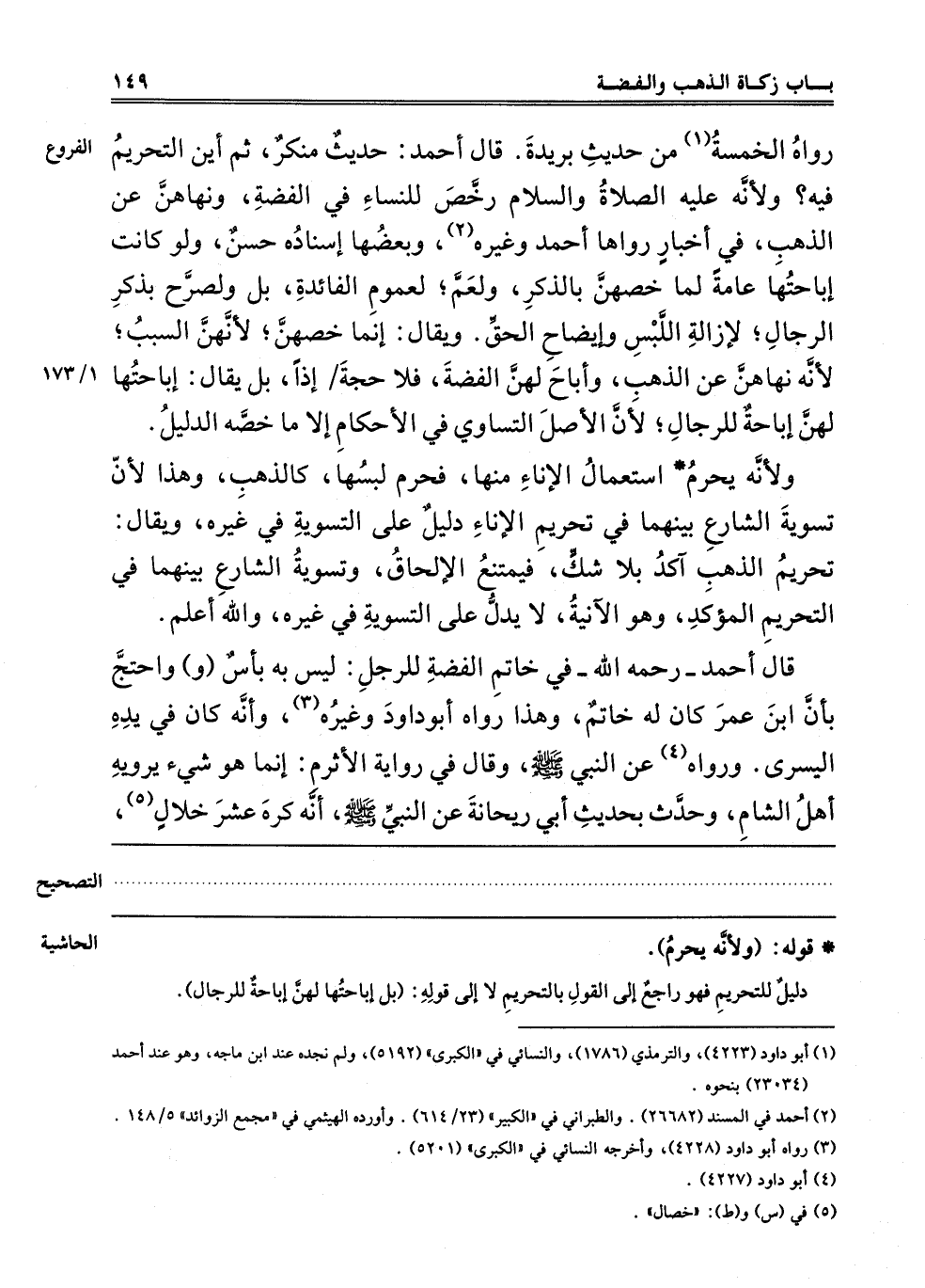 رَوَاهُ الْخَمْسَةُ1 مِنْ حَدِيثِ بُرَيْدَةَ، قَالَ أَحْمَدُ: حَدِيثٌ مُنْكَرٌ، ثُمَّ أَيْنَ التَّحْرِيمُ فِيهِ؟ وَلِأَنَّهُ عَلَيْهِ الصَّلَاةُ وَالسَّلَامُ رَخَّصَ لِلنِّسَاءِ فِي الْفِضَّةِ، وَنَهَاهُنَّ عَنْ الذَّهَبِ، فِي أَخْبَارٍ رَوَاهَا أَحْمَدُ وَغَيْرُهُ2، وَبَعْضُهَا إسْنَادُهُ حَسَنٌ، وَلَوْ كَانَتْ إبَاحَتُهَا عَامَّةً لِمَا خَصَّهُنَّ بِالذِّكْرِ، وَلَعَمَّ، لِعُمُومِ الْفَائِدَةِ، بَلْ وَلَصَرَّحَ بِذِكْرِ الرِّجَالِ، لِإِزَالَةِ اللَّبْسِ وَإِيضَاحِ الْحَقِّ. وَيُقَالُ إنَّمَا خَصَّهُنَّ؛ لِأَنَّهُنَّ السَّبَبُ؛ لِأَنَّهُ نَهَاهُنَّ عَنْ الذَّهَبِ وَأَبَاحَ لَهُنَّ الْفِضَّةَ، فَلَا حُجَّةَ إذًا، بَلْ يُقَالُ: إبَاحَتُهَا لَهُنَّ إبَاحَةٌ لِلرِّجَالِ؛ لِأَنَّ الْأَصْلَ التَّسَاوِي. فِي الْأَحْكَامِ إلَّا مَا خَصَّهُ الدَّلِيلُ.