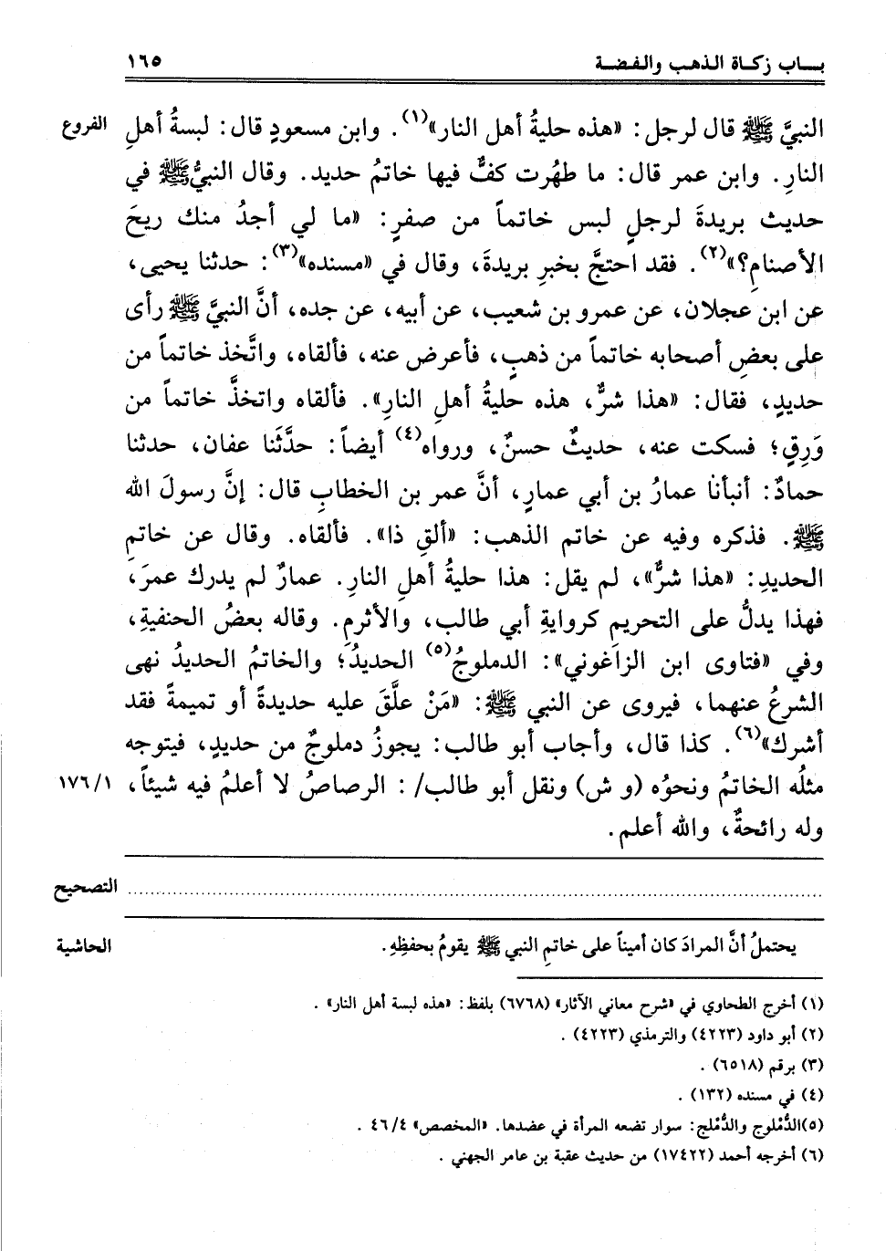 النَّبِيَّ صَلَّى اللَّهُ عَلَيْهِ وَسَلَّمَ قَالَ لِرَجُلٍ: "هَذِهِ حِلْيَةُ أَهْلِ النَّارِ" 1 وَابْنُ مَسْعُودٍ قَالَ: لُبْسَةُ أَهْلِ النَّارِ وَابْنُ عُمَرَ قَالَ: مَا طَهُرَتْ كَفٌّ فِيهَا خَاتَمُ حَدِيدٍ وَقَالَ النَّبِيُّ صَلَّى اللَّهُ عَلَيْهِ وَسَلَّمَ فِي حَدِيثِ بُرَيْدَةَ لِرَجُلٍ لَبِسَ خَاتَمًا مِنْ صُفْرٍ: "مَا لِي أَجِدُ مِنْك رِيحَ الْأَصْنَامِ" 2 فَقَدْ احْتَجَّ بِخَبَرِ بُرَيْدَةَ، وَقَالَ فِي مُسْنَدِهِ3: حَدَّثَنَا يَحْيَى، عَنْ ابْنِ عَجْلَانَ، عَنْ عَمْرِو بْنِ شُعَيْبٍ، عَنْ أَبِيهِ عَنْ جَدِّهِ: أَنَّ النَّبِيَّ صَلَّى اللَّهُ عَلَيْهِ وَسَلَّمَ رَأَى عَلَى بَعْضِ أَصْحَابِهِ خَاتَمًا مِنْ ذَهَبٍ، فَأَعْرَضَ عَنْهُ، فَأَلْقَاهُ وَاِتَّخَذَ خَاتَمًا مِنْ حَدِيدٍ، فَقَالَ: "هَذَا شَرٌّ، هَذِهِ حِلْيَةُ أَهْلِ النَّارِ" فَأَلْقَاهُ وَاِتَّخَذَ خَاتَمًا مِنْ وَرِقٍ، فَسَكَتَ عَنْهُ. حَدِيثٌ حَسَنٌ، وَرَوَاهُ4 أَيْضًا حَدَّثَنَا عَفَّانَ، حَدَّثَنَا حَمَّادٌ، أَنْبَأَنَا عَمَّارُ بْنُ أَبِي عَمَّارٍ أَنَّ عُمَرَ بْنَ الْخَطَّابِ قَالَ: إنَّ رَسُولَ اللَّهِ صَلَّى اللَّهُ عَلَيْهِ وَسَلَّمَ. فَذَكَرَهُ وَفِيهِ عَنْ خَاتَمِ الذَّهَبِ "أَلْقِ ذَا" فَأَلْقَاهُ وَقَالَ عَنْ خَاتَمِ الْحَدِيدِ: "هَذَا شَرٌّ" لَمْ يَقُلْ: هَذَا حِلْيَةُ أَهْلِ النَّارِ عَمَّارٌ لَمْ يُدْرِكْ عُمَرَ فَهَذَا يَدُلُّ عَلَى التَّحْرِيمِ كَرِوَايَةِ أَبِي طَالِبٍ وَالْأَثْرَمِ، وَقَالَهُ بَعْضُ الْحَنَفِيَّةِ. وَفِي فَتَاوَى ابْنِ الزَّاغُونِيِّ: الدُّمْلُوجُ5 الْحَدِيدُ وَالْخَاتَمُ الْحَدِيدُ نَهَى الشَّارِعُ عَنْهُمَا، فَيُرْوَى عَنْ النَّبِيِّ صَلَّى اللَّهُ عَلَيْهِ وَسَلَّمَ "مَنْ عَلَّقَ عَلَيْهِ حَدِيدَةً أَوْ تَمِيمَةً فَقَدْ أَشْرَكَ" 6 كَذَا قَالَ، وَأَجَابَ أَبُو الْخَطَّابِ: يَجُوزُ دُمْلُوجٌ مِنْ حَدِيدٍ، فَيَتَوَجَّهُ مِثْلُهُ الْخَاتَمُ وَنَحْوُهُ "وش" وَنَقَلَ أَبُو طَالِبٍ: الرَّصَاصُ لَا أَعْلَمُ فِيهِ شَيْئًا، وَلَهُ رَائِحَةٌ والله أعلم.