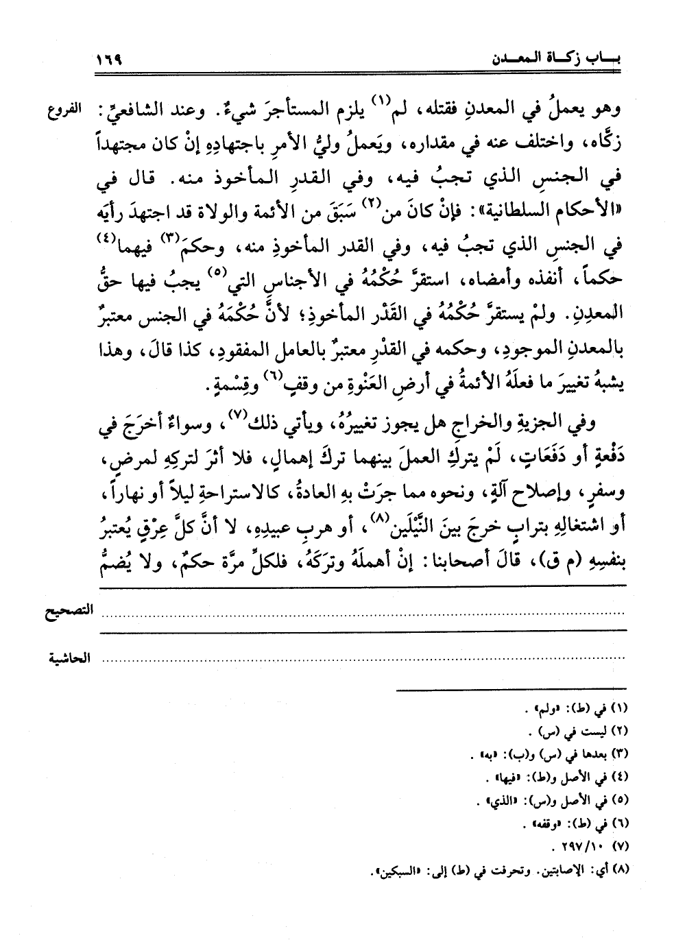 وَفِي الْجِزْيَةِ وَالْخَرَاجِ هَلْ يَجُوزُ تَغْيِيرُهُ، وَيَأْتِي ذَلِكَ7. وَسَوَاءٌ أَخْرَجَهُ فِي دَفْعَةٍ أَوْ دَفَعَاتٍ لَمْ يَتْرُكْ الْعَمَلَ بَيْنَهُمَا تَرْكَ إهْمَالٍ، فَلَا أَثَرَ لِتَرْكِهِ لِمَرَضٍ وَسَفَرٍ وَإِصْلَاحِ آلَةٍ وَنَحْوِهِ مِمَّا جَرَتْ بِهِ الْعَادَةُ، كَالِاسْتِرَاحَةِ لَيْلًا أَوْ نَهَارًا، أَوْ اشْتِغَالِهِ بِتُرَابٍ خَرَجَ بَيْنَ النيلين8، أَوْ هَرَبَ عَبِيدُهُ، لَا أَنَّ كُلَّ عِرْقٍ يُعْتَبَرُ بِنَفْسِهِ "م ق" قَالَ أَصْحَابُنَا: إنْ أَهْمَلَهُ وَتَرَكَهُ فَلِكُلِّ مَرَّةٍ حُكْمٌ. وَلَا يُضَمُّ