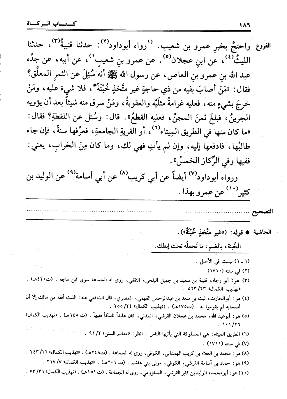 وَاحْتَجَّ بِخَبَرِ عَمْرِو بْنِ شُعَيْبٍ، 1"رَوَاهُ أَبُو دَاوُد2: حَدَّثَنَا قُتَيْبَةُ3، حَدَّثَنَا اللَّيْثُ4، عَنْ ابْنِ عَجْلَانَ5. عَنْ عَمْرِو بْنِ شُعَيْبٍ"1، عَنْ أَبِيهِ، عَنْ جَدِّهِ عَبْدِ اللَّهِ بْنِ عَمْرِو بْنِ الْعَاصِ، عَنْ رَسُولِ اللَّهِ صَلَّى اللَّهُ عَلَيْهِ وَسَلَّمَ أَنَّهُ سُئِلَ عَنْ الثَّمَرِ الْمُعَلَّقِ فَقَالَ: "مَنْ أَصَابَ بِفِيهِ مِنْ ذِي حَاجَةٍ غَيْرَ مُتَّخِذٍ خُبْنَةً فَلَا شَيْءَ عَلَيْهِ، وَمَنْ خَرَجَ بِشَيْءٍ مِنْهُ فَعَلَيْهِ غَرَامَةُ مِثْلَيْهِ وَالْعُقُوبَةُ، وَمَنْ سَرَقَ مِنْهُ شَيْئًا بَعْدَ أَنْ يُؤْوِيَهُ الْجَرِينُ فَبَلَغَ ثَمَنَ الْمِجَنِّ فَعَلَيْهِ الْقَطْعُ"، قَالَ: وَسُئِلَ عَنْ اللُّقَطَةِ فَقَالَ: "مَا كَانَ مِنْهَا فِي الطريق الميتاء6، أو القرية الْجَامِعَةِ، فَعَرِّفْهَا سَنَةً، فَإِنْ جَاءَ طَالِبُهَا فَادْفَعْهَا إلَيْهِ وَإِنْ لَمْ يَأْتِ فَهِيَ لَك، وَمَا كَانَ مِنْ الْخَرَابِ يَعْنِي فَفِيهَا وَفِي الرِّكَازِ الْخُمُسُ".