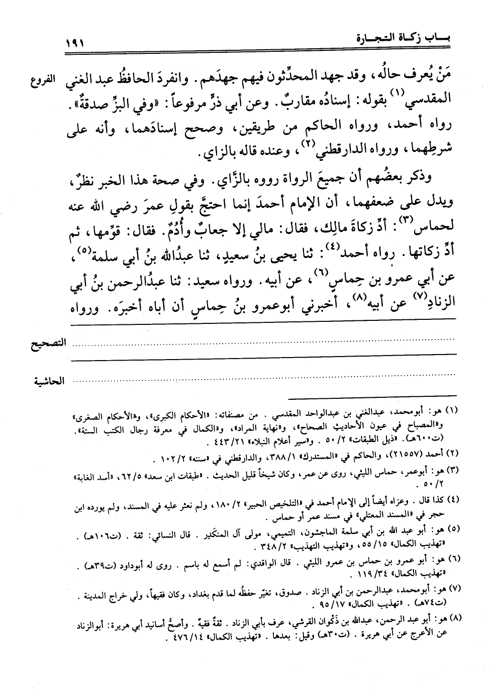 1 هو: أبو محمد، عبد الغني بن عبد الواحد المقدسي. من مصنفاته: "الأحكام الكبرى"، و"الأحكام الصغرى" و"المصباح في عيون الأحاديث الصحاح"، و"نهاية المراد"، و"الكمال في معرفة رجال الكتب الستة". "ت 600 هـ". "ذيل الطبقات" 2/50. و"سير أعلام النبلاء" 21/443.