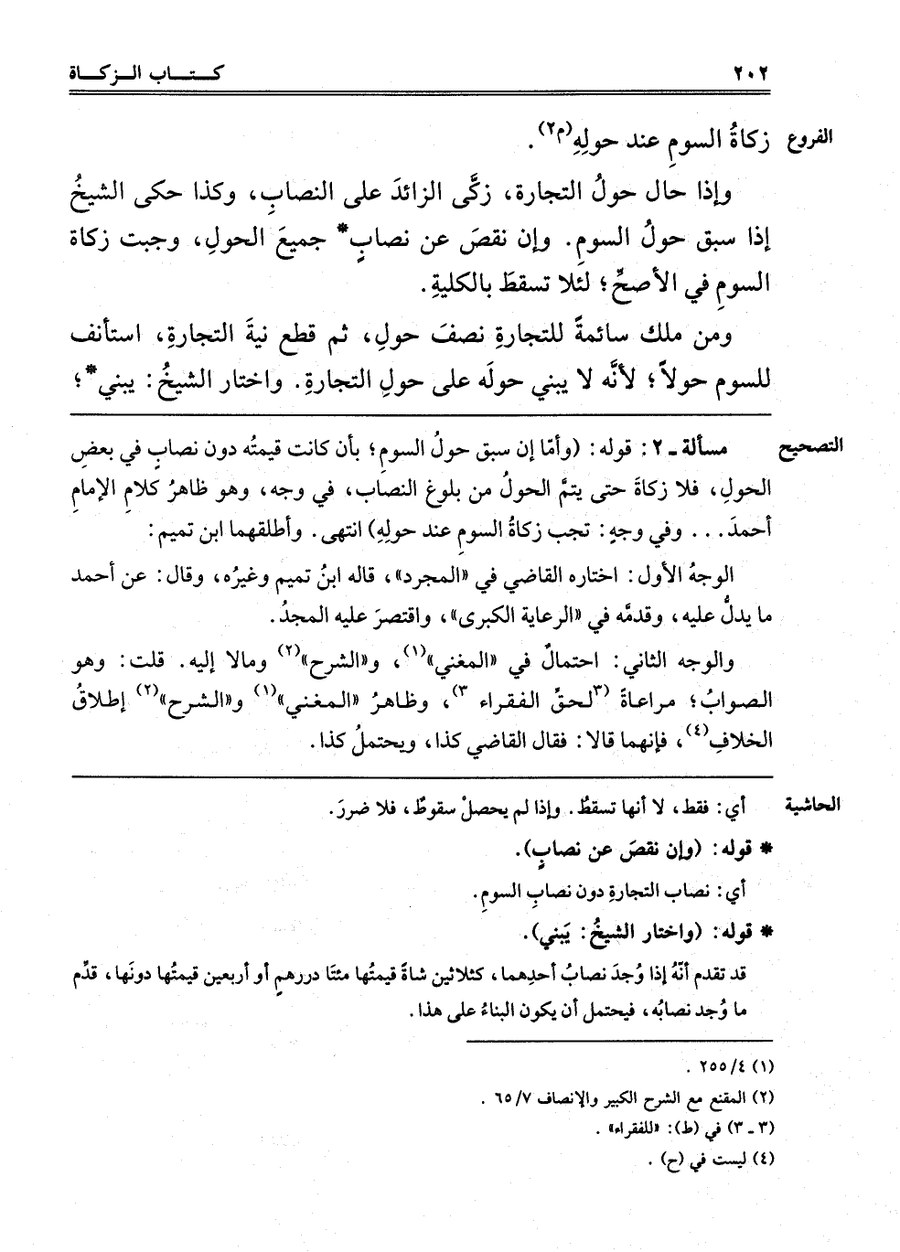 ـــــــــــــــــــــــــــــQمَسْأَلَةٌ - 2: قَوْلُهُ: وَأَمَّا إنْ سَبَقَ حَوْلُ السَّوْمِ، بأن كانت قيمته دون نصاب في بعض الْحَوْلِ، فَلَا زَكَاةَ حَتَّى يُتِمَّ الْحَوْلُ مِنْ بُلُوغِ النِّصَابِ، فِي وَجْهٍ، وَهُوَ ظَاهِرُ كَلَامِ الْإِمَامِ أَحْمَدَ وَفِي وَجْهٍ: تَجِبُ زَكَاةُ السَّوْمِ عِنْدَ حَوْلِهِ، انْتَهَى. وَأَطْلَقَهُمَا ابْنُ تَمِيمٍ: