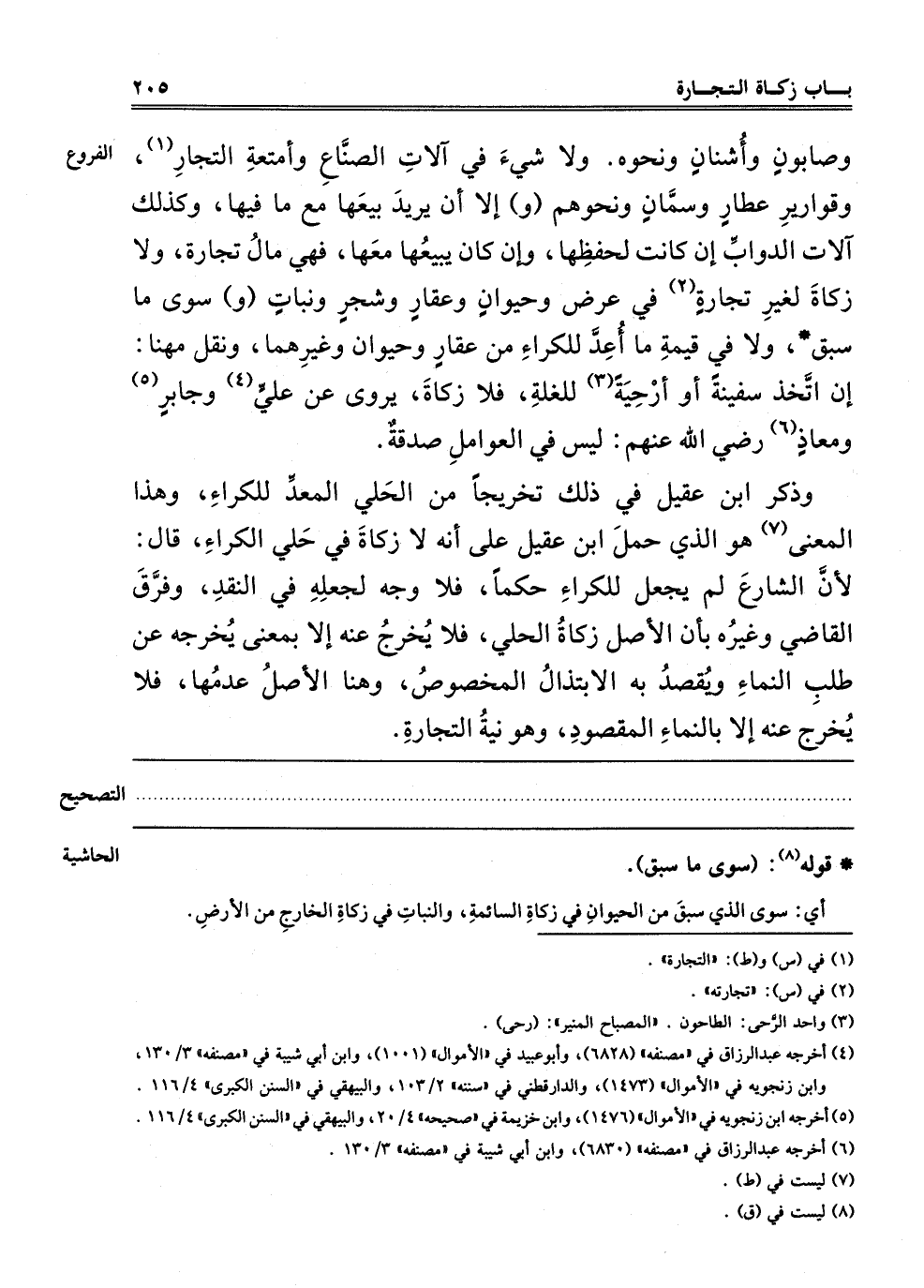 وَصَابُونٍ وَأُشْنَانٍ وَنَحْوِهِ. وَلَا شَيْءَ فِي آلَاتِ الصناع وأمتعة التجار1، وَقَوَارِيرِ عَطَّارٍ وَسِمَانٍ وَنَحْوِهِمْ "و" إلَّا إنْ كَانَ بَيْعُهَا مَعَ مَا فِيهَا، وَكَذَلِكَ آلَاتُ الدَّوَابِّ إنْ كَانَتْ لِحِفْظِهَا، وَإِنْ كَانَ يَبِيعُهَا مَعَهَا فَهِيَ مَالُ تِجَارَةٍ، وَلَا زَكَاةَ لِغَيْرِ تِجَارَةٍ2 فِي عَرْضٍ وَحَيَوَانٍ وَعَقَارٍ وَشَجَرٍ وَنَبَاتٍ "و" سِوَى مَا سَبَقَ، وَلَا فِي قِيمَةِ مَا أُعِدَّ لِلْكِرَاءِ مِنْ عَقَارٍ وَحَيَوَانٍ وَغَيْرِهِمَا "و" وَنَقَلَ مُهَنَّا: إنْ اتَّخَذَ سَفِينَةً أَوْ أَرْحِيَةً3 لِلْغَلَّةِ فَلَا زَكَاةَ، يُرْوَى عَنْ عَلِيٍّ4 وَجَابِرٍ5 وَمُعَاذٍ6 رَضِيَ اللَّهُ عَنْهُمْ: لَيْسَ فِي الْعَوَامِلِ صَدَقَةٌ.