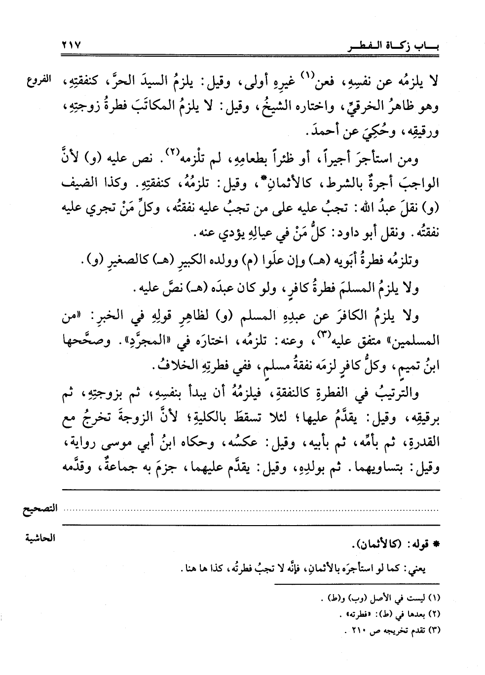 لا يلزمه عن نفسه فعن1 غيره أَوْلَى، وَقِيلَ: يَلْزَمُ السَّيِّدُ الْحُرُّ، كَنَفَقَتِهِ، وَهُوَ ظَاهِرُ الْخِرَقِيِّ، وَاخْتَارَهُ الشَّيْخُ، وَقِيلَ: لَا يَلْزَمُ الْمُكَاتَبَ فِطْرَةُ زَوْجَتِهِ وَرَقِيقِهِ، وَحَكَى عَنْ أَحْمَدَ.