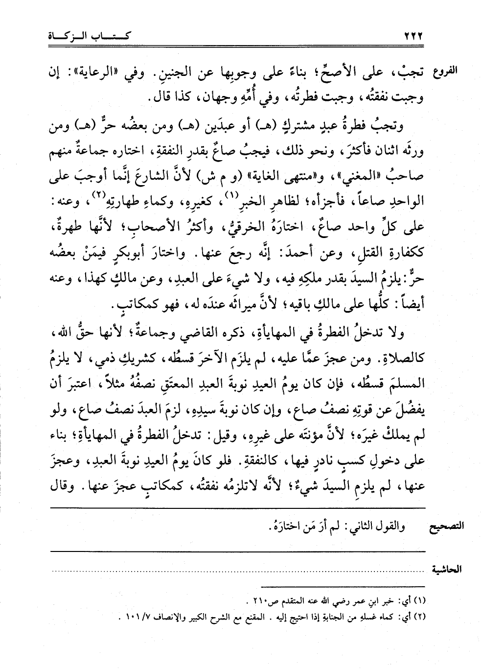 وَتَجِبُ فطرة عبد مشترك "هـ" أو عبدين هـ" وَمَنْ بَعْضُهُ حُرٌّ "هـ" وَمَنْ وَرِثَهُ اثْنَانِ فَأَكْثَرُ، وَنَحْوَ ذَلِكَ، فَيَجِبُ صَاعٌ بِقَدْرِ النَّفَقَةِ، اخْتَارَهُ جَمَاعَةٌ، مِنْهُمْ صَاحِبُ الْمُغْنِي وَمُنْتَهَى الغاية "وم ش"؛ لِأَنَّ الشَّارِعَ إنَّمَا أَوْجَبَ عَلَى الْوَاحِدِ صَاعًا، فَأَجْزَأَهُ، لِظَاهِرِ الْخَبَرِ1، كَغَيْرِهِ، وَكَمَاءِ طَهَارَتِهِ2، وَعَنْهُ: عَلَى كُلِّ وَاحِدِ مِنْهُمَا صَاعٌ، اخْتَارَهُ الْخِرَقِيُّ وَأَكْثَرُ الْأَصْحَابِ؛ لِأَنَّهَا طُهْرَةٌ، كَكَفَّارَةِ الْقَتْلِ، وَعَنْ أَحْمَدَ: إنَّهُ رَجَعَ عَنْهَا، وَاخْتَارَ أَبُو بَكْرٍ فِيمَنْ بَعْضُهُ حُرٌّ يَلْزَمُ السَّيِّدُ بِقَدْرِ مِلْكِهِ فِيهِ وَلَا شَيْءَ عَلَى الْعَبْدِ، وَعَنْ مَالِكٍ كَهَذَا، وَعَنْهُ أَيْضًا: كُلُّهَا عَلَى مَالِكٍ بَاقِيهِ؛ لِأَنَّ مِيرَاثَهُ عِنْدَهُ لَهُ، فَهُوَ كَمُكَاتَبٍ.