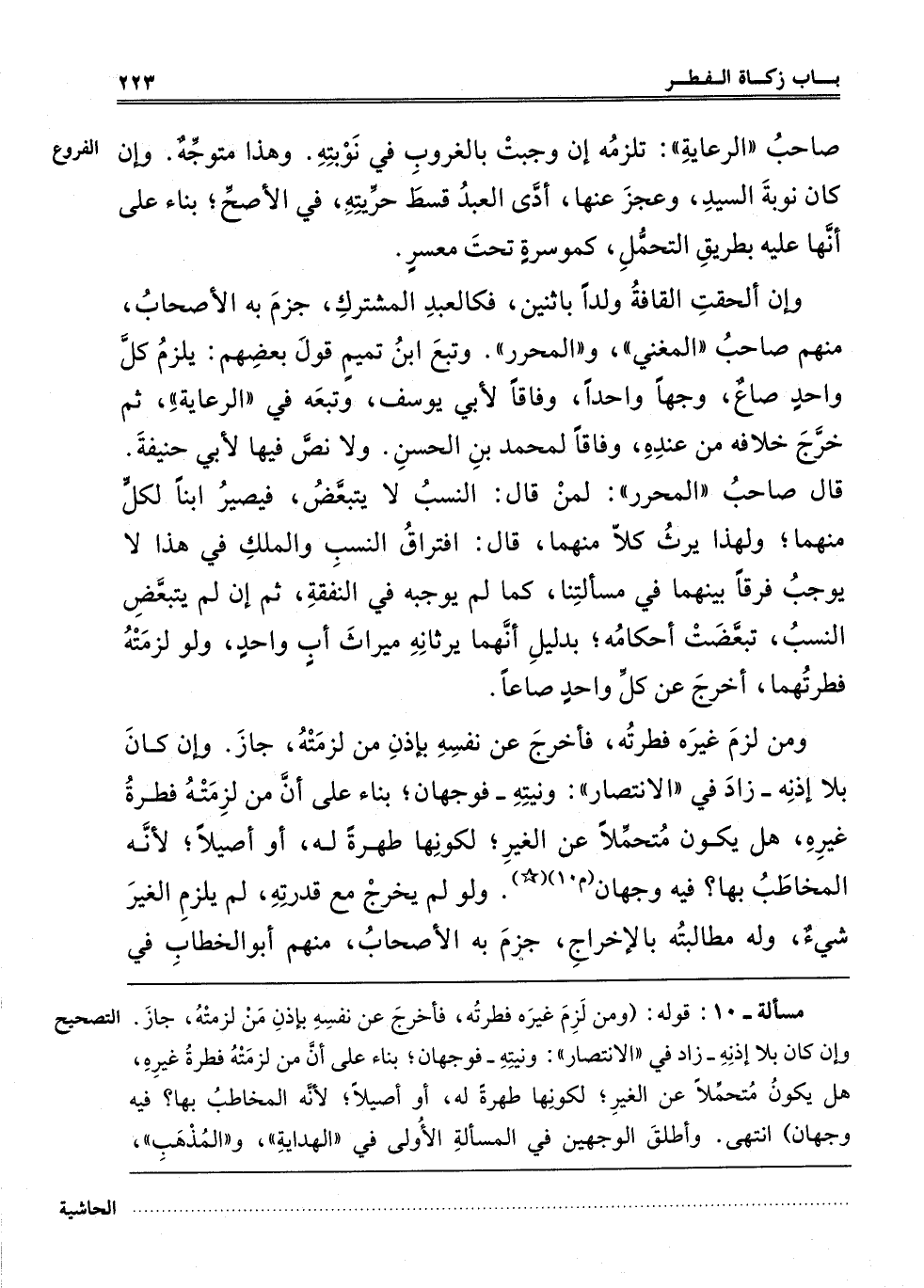 ـــــــــــــــــــــــــــــQمَسْأَلَةٌ - 10: قَوْلُهُ: وَمَنْ لَزِمَ غَيْرَهُ فِطْرَتُهُ فَأَخْرَجَ عن نفسه بإذن من لزمته جاز وإن كان بلا إذنه زاد في الانتصار: ونيته فَوَجْهَانِ، بِنَاءً عَلَى أَنَّ مَنْ لَزِمَتْهُ فِطْرَةُ غَيْرِهِ هَلْ يَكُونُ مُتَحَمِّلًا عَنْ الْغَيْرِ لِكَوْنِهَا طُهْرَةً لَهُ؟ أَوْ أَصِيلًا؛ لِأَنَّهُ الْمُخَاطَبُ بِهَا؟ فِيهِ وَجْهَانِ، انْتَهَى. وَأَطْلَقَ الْوَجْهَيْنِ فِي الْمَسْأَلَةِ الأولى في الهداية والمذهب،
