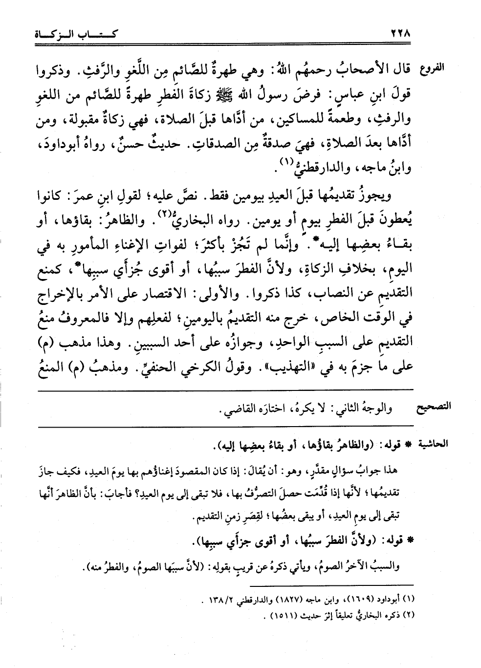 وَيَجُوزُ تَقْدِيمُهَا قَبْلَ الْعِيدِ بِيَوْمَيْنِ فَقَطْ، نَصَّ عَلَيْهِ، لِقَوْلِ ابْنِ عُمَرَ: كَانُوا يُعْطُونَ قَبْلَ الْفِطْرِ بِيَوْمٍ أَوْ بِيَوْمَيْنِ. رَوَاهُ الْبُخَارِيُّ2. وَالظَّاهِرُ بَقَاؤُهَا أَوْ بَقَاءُ بَعْضِهَا إلَيْهِ، وَإِنَّمَا لَمْ تَجُزْ بِأَكْثَرَ لِفَوَاتِ الْإِغْنَاءِ الْمَأْمُورِ بِهِ فِي الْيَوْمِ، بِخِلَافِ الزَّكَاةِ، وَلِأَنَّ الْفِطْرَ سَبَبُهَا وَأَقْوَى جُزْأَيْ سَبَبِهَا، كَمَنْعِ التَّقْدِيمِ عَلَى النِّصَابِ، كَذَا ذَكَرُوا، وَالْأَوْلَى الِاقْتِصَارُ عَلَى الْأَمْرِ بِالْإِخْرَاجِ فِي الْوَقْتِ الْخَاصِّ، خَرَجَ مِنْهُ التَّقْدِيمُ، بِالْيَوْمَيْنِ لِفِعْلِهِمْ وَإِلَّا فَالْمَعْرُوفُ مَنْعُ التَّقْدِيمِ عَلَى السَّبَبِ الْوَاحِدِ، وَجَوَازُهُ عَلَى أَحَدِ السببين، وهذا مذهب "م" عَلَى مَا جَزَمَ بِهِ فِي التَّهْذِيبِ، وَقَوْلُ الكرخي الحنفي، ومذهب "م" المنع