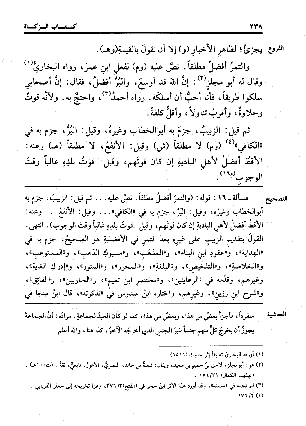 ـــــــــــــــــــــــــــــQمَسْأَلَةٌ - 16: قَوْلُهُ: وَالتَّمْرُ أَفْضَلُ مُطْلَقًا، نَصَّ عَلَيْهِ ثُمَّ قِيلَ: الزَّبِيبُ، جَزَمَ بِهِ أَبُو الْخَطَّابِ وَغَيْرُهُ، وَقِيلَ: الْبُرُّ، جَزَمَ بِهِ فِي الْكَافِي وَقِيلَ: الْأَنْفَعُ وَعَنْهُ: الْأَقِطُ أَفْضَلُ لِأَهْلِ الْبَادِيَةِ إنْ كَانَ قُوتَهُمْ، وَقِيلَ: قُوتُ بَلَدِهِ غَالِبًا وَقْتَ الْوُجُوبِ، انْتَهَى الْقَوْلُ بِتَقْدِيمِ الزَّبِيبِ عَلَى غَيْرِهِ بَعْدَ التَّمْرِ فِي الْأَفْضَلِيَّةِ هُوَ الصَّحِيحُ، جَزَمَ بِهِ فِي الْهِدَايَةِ وَعُقُودِ ابْنِ الْبَنَّا وَالْمُذْهَبِ وَمَسْبُوكِ الذَّهَبِ وَالْمُسْتَوْعِبِ وَالْخُلَاصَةِ وَالتَّلْخِيصِ وَالْبُلْغَةِ وَالْمُحَرَّرِ وَالْمُنَوِّرِ وَإِدْرَاكِ الْغَايَةِ وَغَيْرِهِمْ، وَقَدَّمَهُ فِي الرِّعَايَتَيْنِ وَمُخْتَصَرِ ابْنِ تَمِيمٍ وَالْحَاوِيَيْنِ وَالْفَائِقِ وَشَرْحِ ابْنِ رَزِينٍ وَغَيْرِهِمْ، وَاخْتَارَهُ ابْنُ عَبْدُوسٍ فِي تَذْكِرَتِهِ، قَالَ ابْنُ منجا في