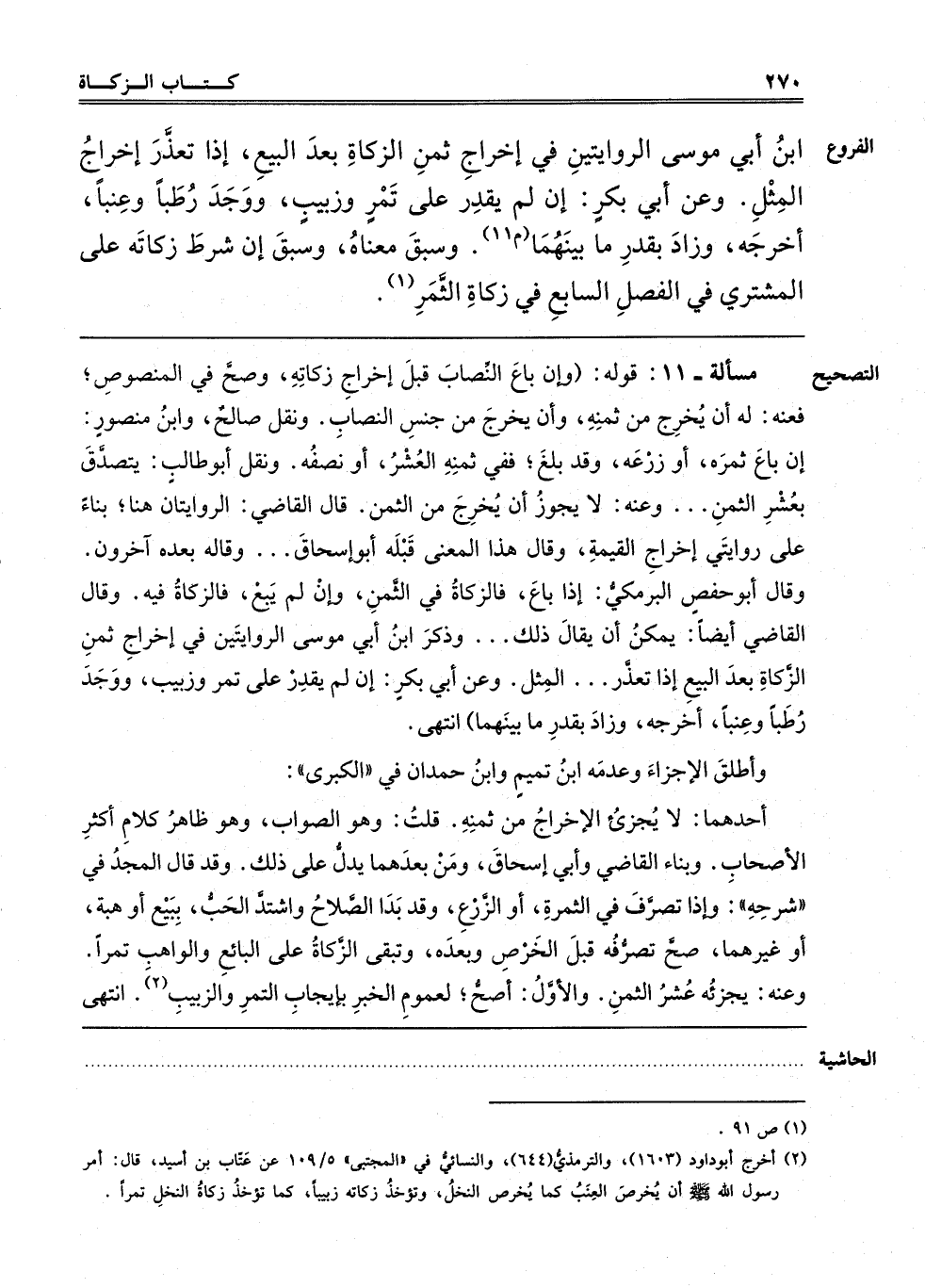 إحْدَاهُمَا: لَا يُجْزِئُ الْإِخْرَاجُ مِنْ ثَمَنِهِ. قُلْت: وَهُوَ الصَّوَابُ، وَهُوَ ظَاهِرُ كَلَامِ أَكْثَرِ الْأَصْحَابِ، وَبِنَاءُ الْقَاضِي وَأَبِي إِسْحَاقَ وَمَنْ بَعْدَهُمَا يَدُلُّ عَلَى ذَلِكَ، وَقَدْ قَالَ الْمَجْدُ فِي شَرْحِهِ: وَإِذَا تَصَرَّفَ فِي الثَّمَرَةِ أَوْ الزَّرْعِ وَقَدْ بَدَا الصَّلَاحُ وَاشْتَدَّ الْحُبُّ بِبَيْعٍ أَوْ هِبَةٍ أَوْ غَيْرِهِمَا صَحَّ تَصَرُّفُهُ قَبْلَ الْخَرْصِ وَبَعْدَهُ، وَتَبْقَى الزَّكَاةُ عَلَى الْبَائِعِ وَالْوَاهِبِ تَمْرًا، وَعَنْهُ: يُجْزِئُهُ عُشْرُ الثَّمَنِ، وَالْأَوَّلُ أَصَحُّ، لِعُمُومِ الْخَبَرِ بِإِيجَابِ التَّمْرِ والزبيب2. انتهى