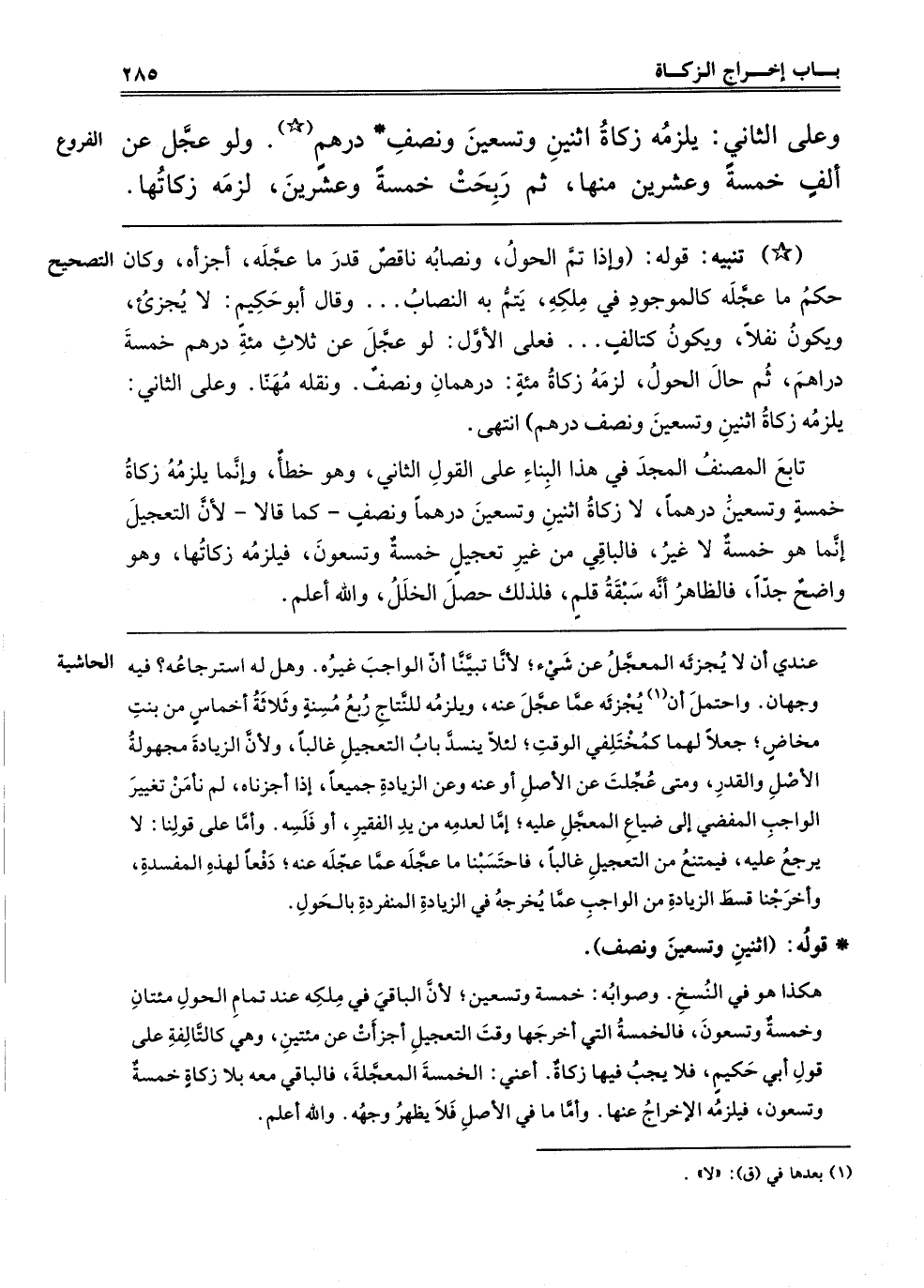 ـــــــــــــــــــــــــــــQ"*" تَنْبِيهٌ: قَوْلُهُ: وَإِذَا تَمَّ الْحَوْلُ وَنِصَابُهُ نَاقِصٌ قَدْرَ مَا عَجَّلَهُ أَجْزَأَهُ، وَكَانَ حُكْمُ مَا عَجَّلَهُ كَالْمَوْجُودِ فِي مِلْكِهِ يَتِمُّ بِهِ النِّصَابُ. وَقَالَ أَبُو حَكِيمٍ: لَا يُجْزِئُ وَيَكُونُ نَفْلًا، وَيَكُونُ كَتَالِفٍ، فَعَلَى الْأَوَّلِ لَوْ عَجَّلَ عَنْ ثَلَاثِمِائَةِ دِرْهَمٍ خَمْسَةَ دَرَاهِمِ ثُمَّ حَالَ الْحَوْلُ لزمه زكاة مائة، درهمان ونصف، ونقله مهنا، وَعَلَى الثَّانِي يَلْزَمُهُ زَكَاةُ اثْنَيْنِ وَتِسْعِينَ دِرْهَمًا وَنِصْفِ دِرْهَمٍ، انْتَهَى.