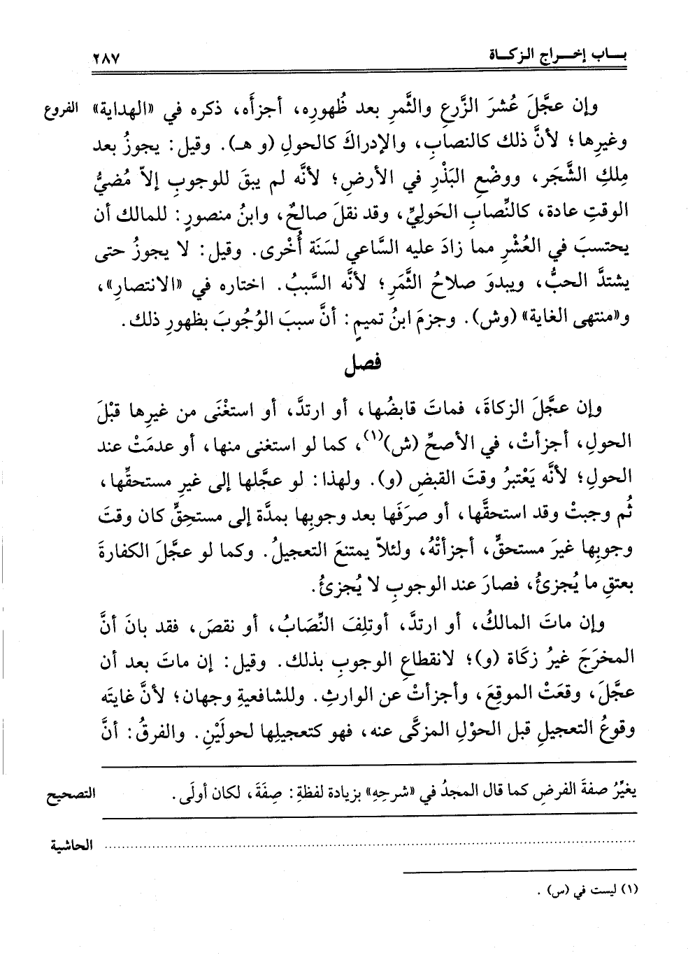 وَإِنْ عَجَّلَ عُشْرَ الزَّرْعِ وَالثَّمَرَةِ بَعْدَ ظُهُورِهِ أَجْزَأَهُ، ذَكَرَهُ فِي الْهِدَايَةِ وَغَيْرِهَا؛ لِأَنَّ ذَلِكَ كالنصاب، والإدراك كالحول "وهـ" وَقِيلَ: يَجُوزُ بَعْدَ مِلْكِ الشَّجَرِ وَوَضْعِ الْبَذْرِ فِي الْأَرْضِ؛ لِأَنَّهُ لَمْ يَبْقَ لِلْوُجُوبِ إلَّا مُضِيُّ الْوَقْتِ عَادَةً، كَالنِّصَابِ الْحَوْلِيِّ، وَقَدْ نَقَلَ صَالِحٌ وَابْنُ مَنْصُورٍ: لِلْمَالِكِ أَنْ يَحْتَسِبَ فِي الْعُشْرِ مِمَّا زَادَ عَلَيْهِ السَّاعِي لِسَنَةٍ أُخْرَى. وَقِيلَ: لَا يَجُوزُ حَتَّى يَشْتَدَّ الْحَبُّ وَيَبْدُوَ صَلَاحُ الثَّمَرَةِ؛ لِأَنَّهُ السَّبَبُ، اخْتَارَهُ فِي الِانْتِصَارِ ومنتهى الغاية "وش" وَجَزَمَ ابْنُ تَمِيمٍ أَنَّ سَبَبَ الْوُجُوبِ بِظُهُورِ ذلك.