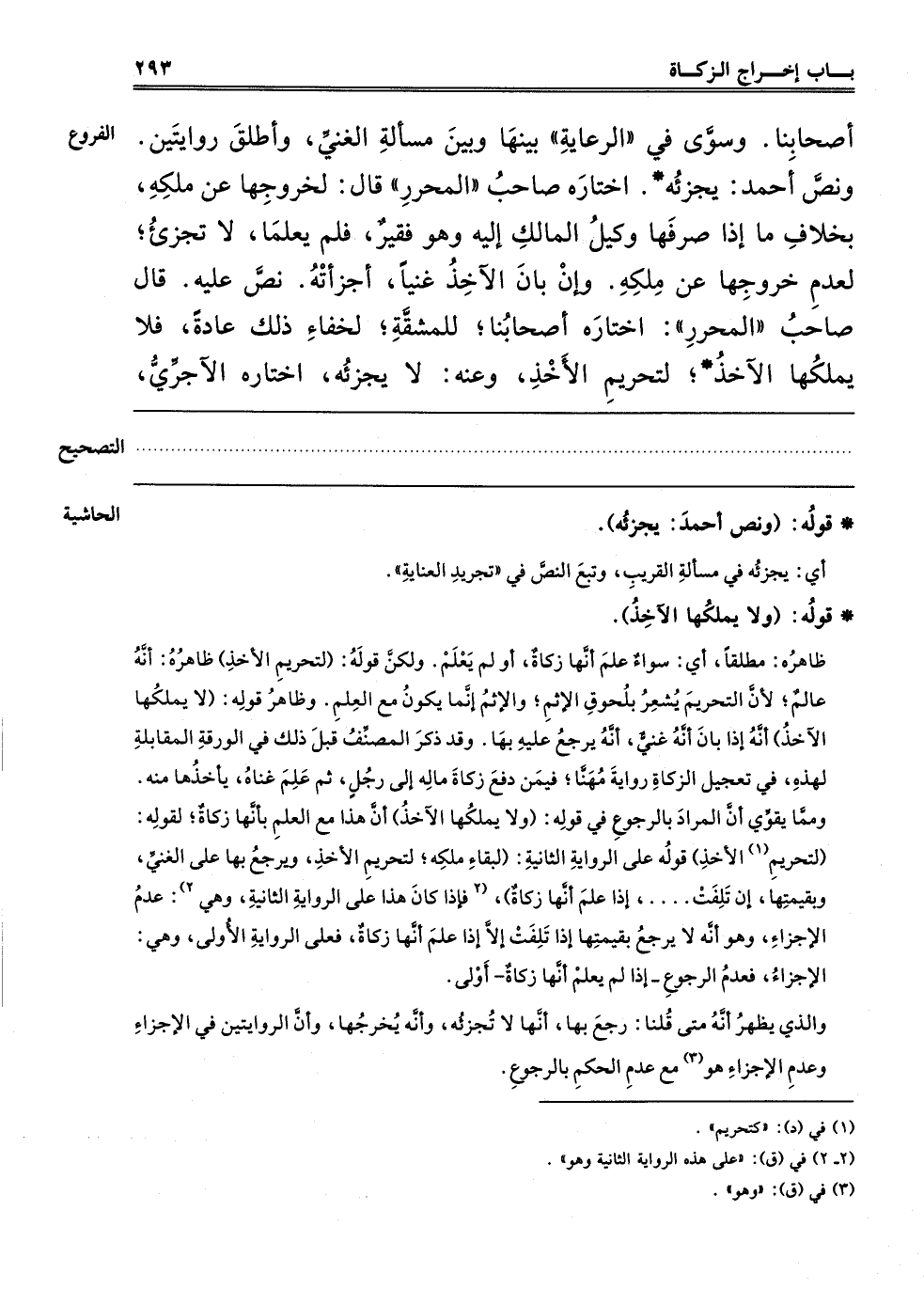 أَصْحَابِنَا. وَسَوَّى فِي الرِّعَايَةِ بَيْنَهَا وَبَيْنَ مَسْأَلَةِ الْغِنَى، وَأَطْلَقَ رِوَايَتَيْنِ، وَنَصَّ أَحْمَدُ: يُجْزِئُهُ، اخْتَارَهُ صَاحِبُ الْمُحَرَّرِ، قَالَ: لِخُرُوجِهَا عَنْ مِلْكِهِ، بِخِلَافِ مَا إذَا صَرَفَهَا وَكِيلُ الْمَالِكِ إلَيْهِ وَهُوَ فَقِيرٌ فَلَمْ يَعْلَمْهَا لَا تُجْزِئُ، لِعَدَمِ خُرُوجِهَا عَنْ مِلْكِهِ، وَإِنْ بَانَ الْآخِذُ غَنِيًّا أَجْزَأَتْهُ، نَصَّ عَلَيْهِ. قَالَ صَاحِبُ الْمُحَرَّرِ: اخْتَارَهُ أَصْحَابُنَا، لِلْمَشَقَّةِ، لِخَفَاءِ ذَلِكَ عَادَةً، فَلَا يَمْلِكُهَا الْآخِذُ، لِتَحْرِيمِ الْأَخْذِ، وَعَنْهُ: لَا يُجْزِئُهُ، اخْتَارَهُ الْآجُرِّيُّ،
