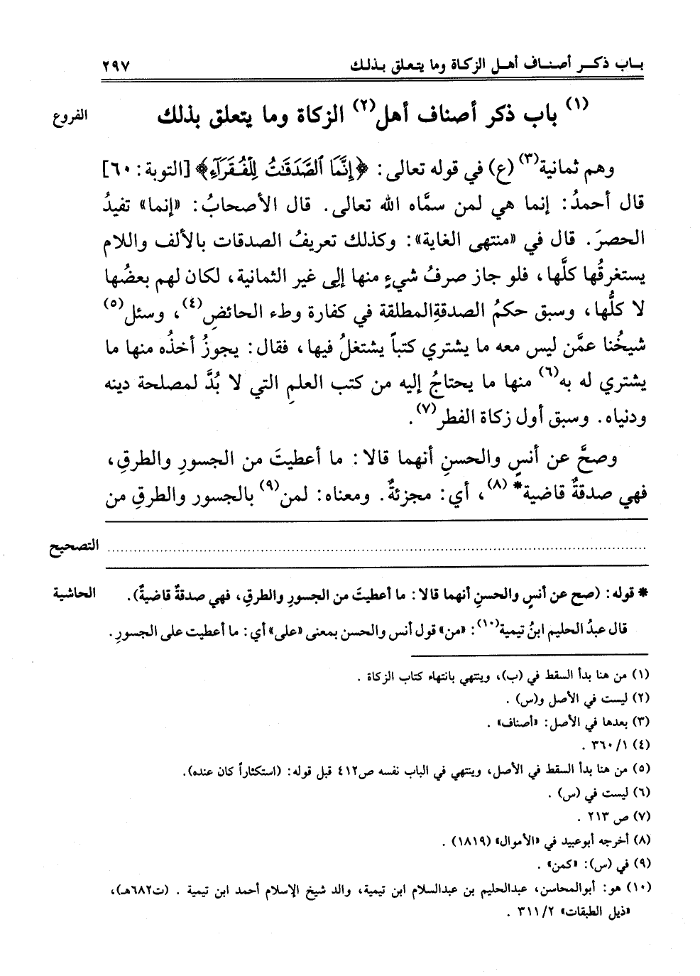 وَهُمْ ثَمَانِيَةٌ3 "ع" فِي قَوْله تَعَالَى: {إِنَّمَا الصَّدَقَاتُ لِلْفُقَرَاءِ} [التوبة: 60] الْآيَةَ. قَالَ أَحْمَدُ: إنَّمَا هِيَ لِمَنْ سَمَّاهُ اللَّهُ تَعَالَى. قَالَ الْأَصْحَابُ: "إنَّمَا" تُفِيدُ الْحَصْرَ، قَالَ فِي مُنْتَهَى الْغَايَةِ: وَكَذَلِكَ تَعْرِيفُ الصَّدَقَاتِ بِالْأَلِفِ وَاللَّامِ يَسْتَغْرِقُهَا كُلُّهَا، فَلَوْ جَازَ صَرْفُ شَيْءٍ مِنْهَا إلَى غَيْرِ الثَّمَانِيَةِ لَكَانَ لَهُمْ بَعْضُهَا لَا كُلُّهَا، وَسَبَقَ حُكْمُ الصَّدَقَةِ الْمُطْلَقَةِ فِي كَفَّارَةِ وَطْءِ الْحَائِضِ4، وَسُئِلَ5 شَيْخُنَا عَمَّنْ لَيْسَ مَعَهُ مَا يَشْتَرِي كُتُبًا يَشْتَغِلُ فِيهَا فَقَالَ: يَجُوزُ أَخْذُهُ مِنْهَا مَا يَشْتَرِي لَهُ بِهِ6 مِنْهَا مَا يَحْتَاجُ إلَيْهِ مِنْ كُتُبِ الْعِلْمِ الَّتِي لَا بُدَّ لِمَصْلَحَةِ دِينِهِ وَدُنْيَاهُ. وَسَبَقَ أَوَّلَ زَكَاةِ الْفِطْرِ7.