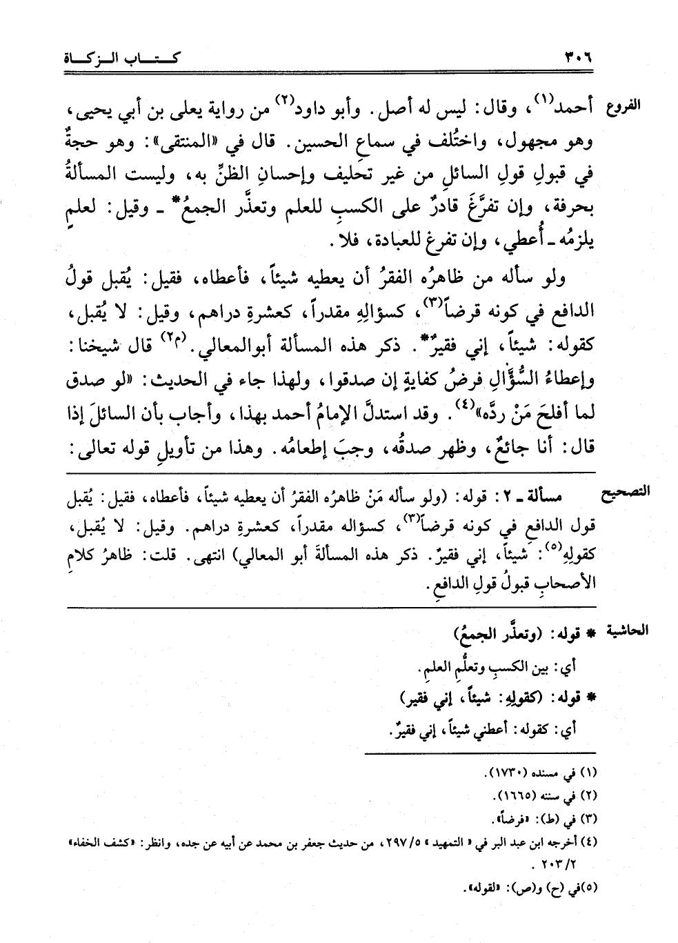 أَحْمَدُ1 وَقَالَ: لَيْسَ لَهُ أَصْلٌ، وَأَبُو دَاوُد2 مِنْ رِوَايَةِ يَعْلَى بْنِ أَبِي يَحْيَى، وَهُوَ مَجْهُولٌ، وَاخْتَلَفَ فِي سَمَاعِ الْحُسَيْنِ، قَالَ فِي الْمُنْتَقَى: وَهُوَ حُجَّةٌ فِي قَبُولِ قَوْلِ السَّائِلِ مِنْ غَيْرِ تَحْلِيفٍ وَإِحْسَانِ الظَّنِّ بِهِ وَلَيْسَتْ الْمَسْأَلَةُ بِحَرْفِهِ، وَإِنْ تَفَرَّغَ قَادِرٌ عَلَى الْكَسْبِ لِلْعِلْمِ وَتَعَذَّرَ الْجَمْعُ وَقِيلَ: لِعِلْمٍ يَلْزَمُهُ أُعْطِيَ، وَإِنْ تَفَرَّغَ لِلْعِبَادَةِ فَلَا.