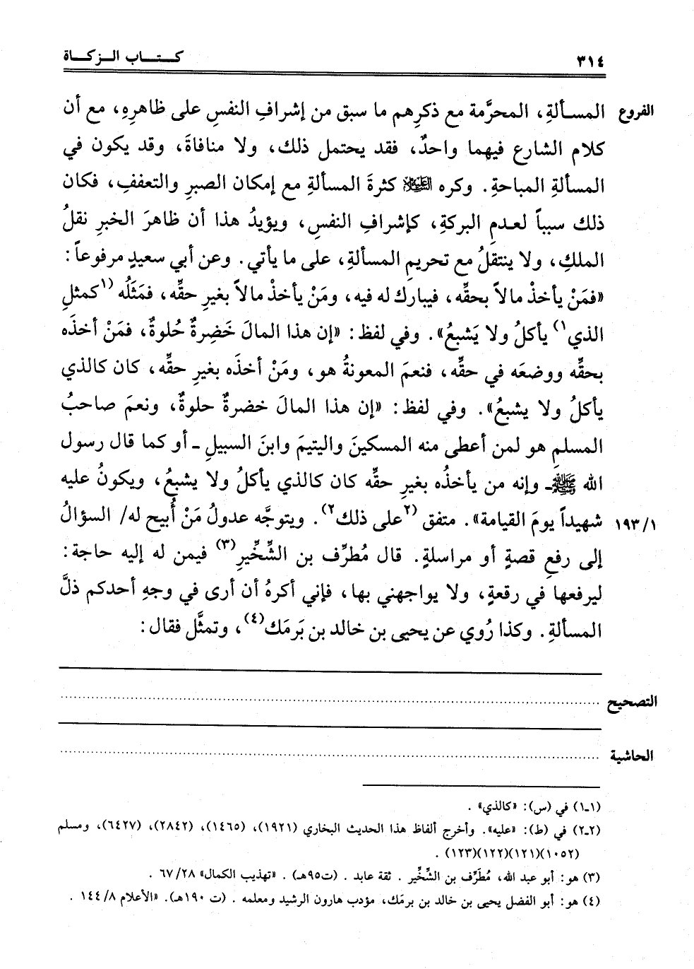 الْمَسْأَلَةِ، الْمُحَرَّمَةِ مَعَ ذَكَرِهِمْ مَا سَبَقَ مِنْ إشْرَافِ النَّفْسِ عَلَى ظَاهِرِهِ، مَعَ أَنَّ كَلَامَ الشَّارِعِ فِيهِمَا وَاحِدٌ، فَقَدْ يُحْتَمَلُ ذَلِكَ، وَلَا مُنَافَاةَ، وَقَدْ يَكُونُ فِي الْمَسْأَلَةِ الْمُبَاحَةِ. وَكُرِهَ عَلَيْهِ السَّلَامُ كَثْرَةُ الْمَسْأَلَةِ مَعَ إمْكَانِ الصَّبْرِ وَالتَّعَفُّفِ، فَكَانَ ذَلِكَ سَبَبًا لِعَدَمِ الْبَرَكَةِ، كَإِشْرَافِ النَّفْسِ، وَيُؤَيِّدُ هَذَا أَنَّ ظَاهِرَ الْخَبَرِ نَقْلُ الْمِلْكِ، وَلَا يَنْتَقِلُ مَعَ تَحْرِيمِ الْمَسْأَلَةِ. عَلَى مَا سَيَأْتِي، وَعَنْ أَبِي سَعِيدٍ مَرْفُوعًا: "فَمَنْ يَأْخُذُ مَالًا بِحَقِّهِ فَيُبَارَكُ لَهُ فِيهِ، وَمَنْ يَأْخُذُ مَالًا بِغَيْرِ حَقِّهِ فَمَثَلُهُ 1"كَمَثَلِ الَّذِي"1 يَأْكُلُ وَلَا يَشْبَعُ". وَفِي لَفْظٍ: "إنَّ هَذَا الْمَالَ خَضِرَةٌ حُلْوَةٌ، فَمَنْ أَخَذَهُ بِحَقِّهِ وَوَضَعَهُ فِي حَقِّهِ فَنِعْمَ الْمَعُونَةُ هُوَ، وَمَنْ أَخَذَهُ بِغَيْرِ حَقِّهِ كَانَ كَاَلَّذِي يَأْكُلُ وَلَا يَشْبَعُ". وَفِي لَفْظٍ "إنَّ هَذَا الْمَالَ خَضِرَةٌ حُلْوَةٌ، وَنِعْمَ صَاحِبُ الْمُسْلِمِ هُوَ لِمَنْ أَعْطَى مِنْهُ الْمِسْكَيْنِ وَالْيَتِيمَ وَابْنَ السَّبِيلِ أَوْ كَمَا قَالَ رَسُولُ اللَّهِ صَلَّى اللَّهُ عَلَيْهِ وَسَلَّمَ: "وَإِنَّهُ مَنْ يَأْخُذُهُ بِغَيْرِ حَقِّهِ كَانَ كَاَلَّذِي يَأْكُلُ وَلَا يَشْبَعُ وَيَكُونُ عَلَيْهِ شَهِيدًا يَوْمَ الْقِيَامَةِ". مُتَّفَقٌ 2"عَلَى ذَلِكَ"2 وَيُتَوَجَّهُ عُدُولُ مَنْ أُبِيحَ لَهُ السُّؤَالُ إلَى رَفْعِ قِصَّةٍ أَوْ مُرَاسَلَةٍ، قَالَ مُطَرِّفُ بْنُ الشِّخِّيرِ3 فِيمَنْ لَهُ إلَيْهِ حَاجَةٌ: لِيَرْفَعَهَا فِي رُقْعَةٍ وَلَا يُوَاجِهُنِي فَإِنِّي أَكْرَهُ أَنْ أَرَى فِي وَجْهِ أَحَدِكُمْ ذُلَّ الْمَسْأَلَةِ. وَكَذَا رُوِيَ عَنْ يَحْيَى بْنِ خَالِدِ بن برمك4، وتمثل فقال: