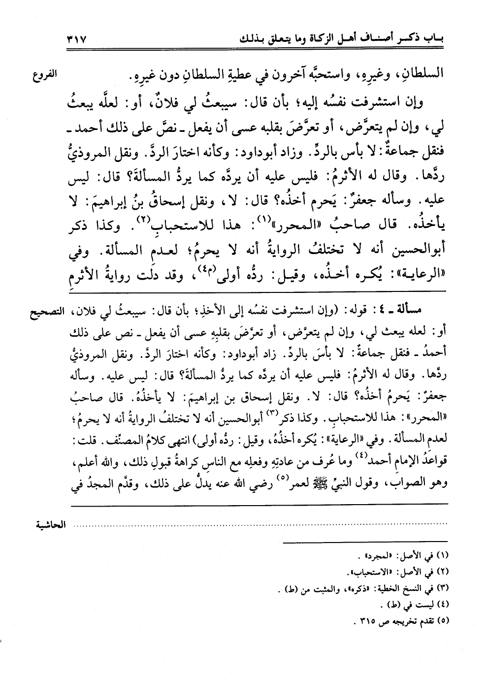 ـــــــــــــــــــــــــــــQمَسْأَلَةٌ - 4: قَوْلُهُ: وَإِنْ اسْتَشْرَفَتْ نَفْسُهُ إلَى الْأَخْذِ بِأَنْ قَالَ سَيَبْعَثُ لِي فُلَانٌ أَوْ لَعَلَّهُ يَبْعَثُ لِي وَإِنْ لَمْ يَتَعَرَّضْ أَوْ تَعَرَّضَ بِقَلْبِهِ عَسَى أَنْ يَفْعَلَ نَصَّ عَلَى ذَلِكَ أحمد فَنَقَلَ جَمَاعَةٌ لَا بَأْسَ بِالرَّدِّ، زَادَ أَبُو دَاوُد: وَكَأَنَّهُ اخْتَارَ الرَّدَّ، وَنَقَلَ الْمَرُّوذِيُّ رَدَّهَا، وَقَالَ لَهُ الْأَثْرَمُ: فَلَيْسَ عَلَيْهِ أَنْ يَرُدَّهُ كَمَا يَرُدُّ الْمَسْأَلَةَ؟ قَالَ: لَيْسَ عَلَيْهِ، وَسَأَلَهُ جَعْفَرٌ: يَحْرُمُ أَخْذُهُ؟ قَالَ: لَا، وَنَقَلَ إِسْحَاقُ بْنُ إبْرَاهِيم: لَا يَأْخُذُهُ، قَالَ صَاحِبُ الْمُحَرَّرِ: هَذَا لِلِاسْتِحْبَابِ. وَكَذَا ذَكَرَ3 أَبُو الْحُسَيْنِ أَنَّهُ لَا تَخْتَلِفُ الرَّوِيَّةُ أَنَّهُ لَا يَحْرُمُ، لِعَدَمِ الْمَسْأَلَةِ. وَفِي الرِّعَايَةِ: يُكْرَهُ أَخْذُهُ، وَقِيلَ: رَدُّهُ أَوْلَى، انْتَهَى كَلَامُ الْمُصَنِّفِ. قُلْت: قَوَاعِدُ الْإِمَامِ أحمد4 وَمَا عُرِفَ مِنْ عَادَتِهِ وَفِعْلِهِ مَعَ النَّاسِ كَرَاهَةُ قَبُولِ ذَلِكَ، وَاَللَّهُ أَعْلَمُ، وَهُوَ الصَّوَابُ، وَقَوْلُ النَّبِيِّ صَلَّى اللَّهُ عَلَيْهِ وَسَلَّمَ لِعُمَرَ5 رَضِيَ اللَّهُ عَنْهُ يَدُلُّ عَلَى ذَلِكَ، وَقَدَّمَ المجد في